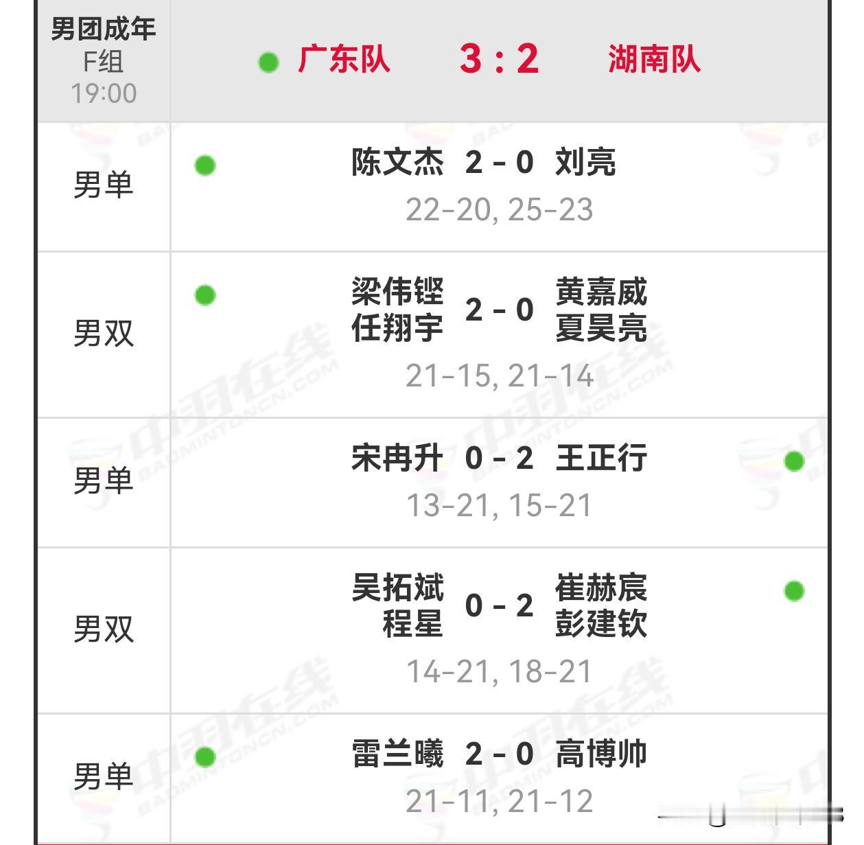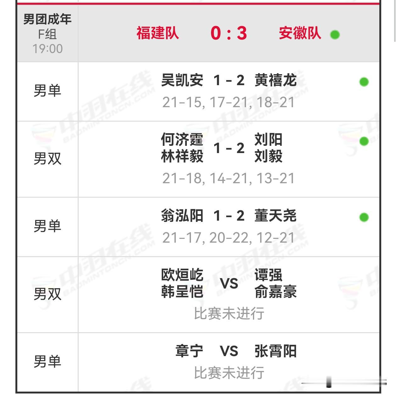 在第十五届全运会羽毛球男团小组赛最后一场,福建面对小组倒数第二的安徽队,竟以0-3被对方拿下比赛,无缘半决赛。 在此前的小组赛福建队表现还不错,3-1广东队,2-3湖南队,3-0江西队,3-2上海队,只要拿下这场比赛就能晋级的,福建可是上届全运会男团冠军得主,有点不应该。从今晚的比赛来看,两个单打都没发挥好,吴凯安和翁泓阳都是拿下首局后被逆转。 四强分别是广东队、湖南队、江苏队和浙江队。