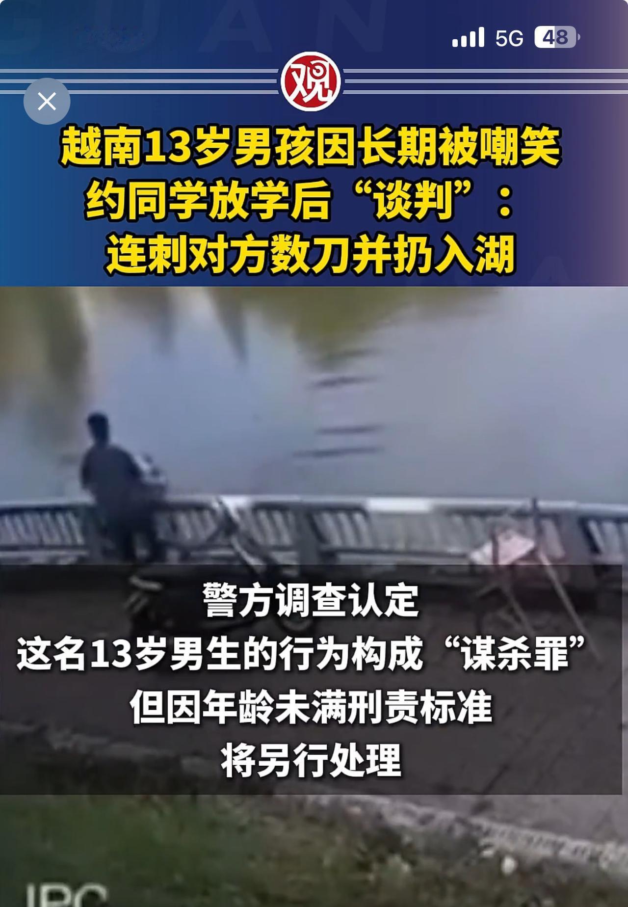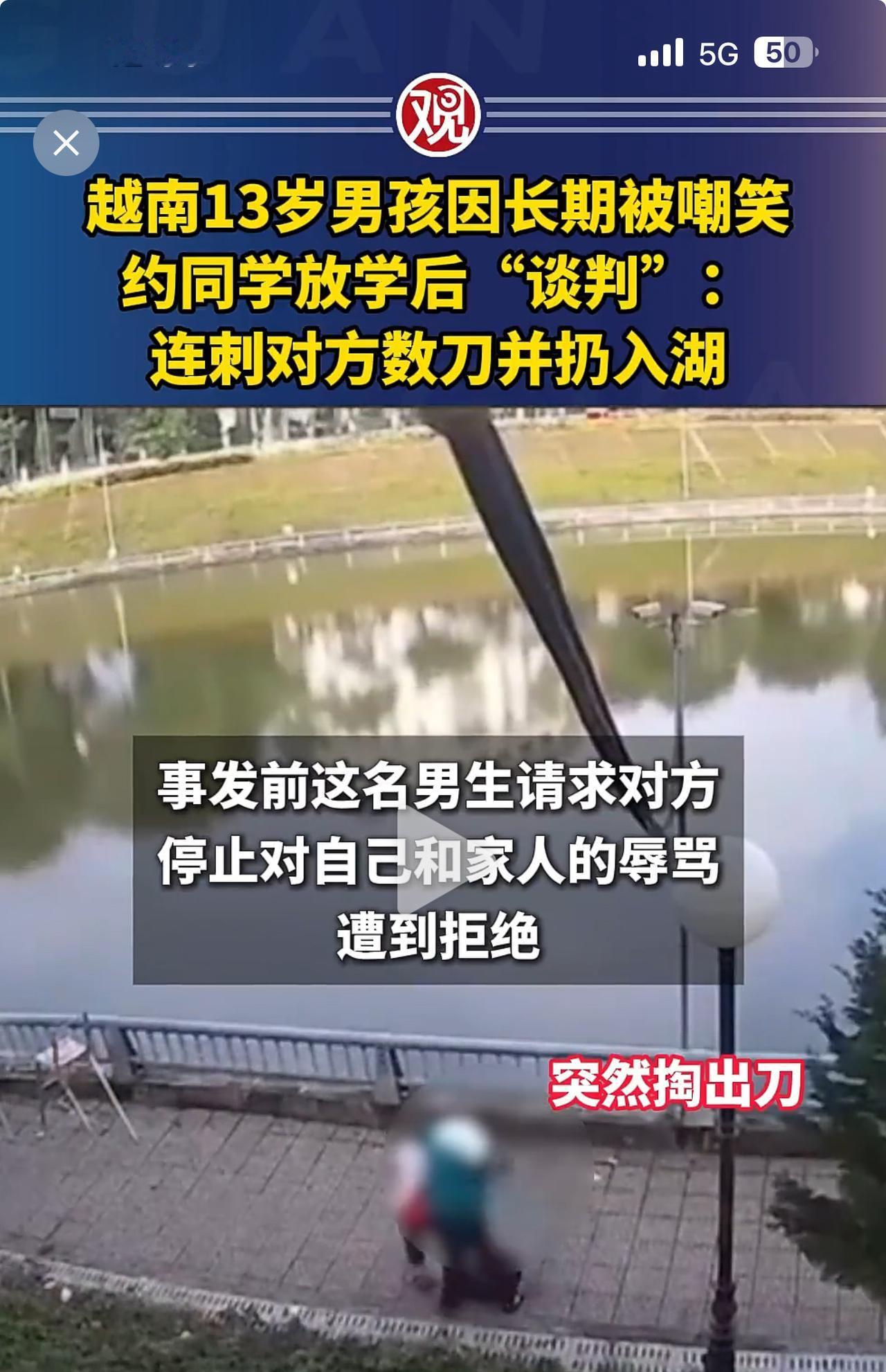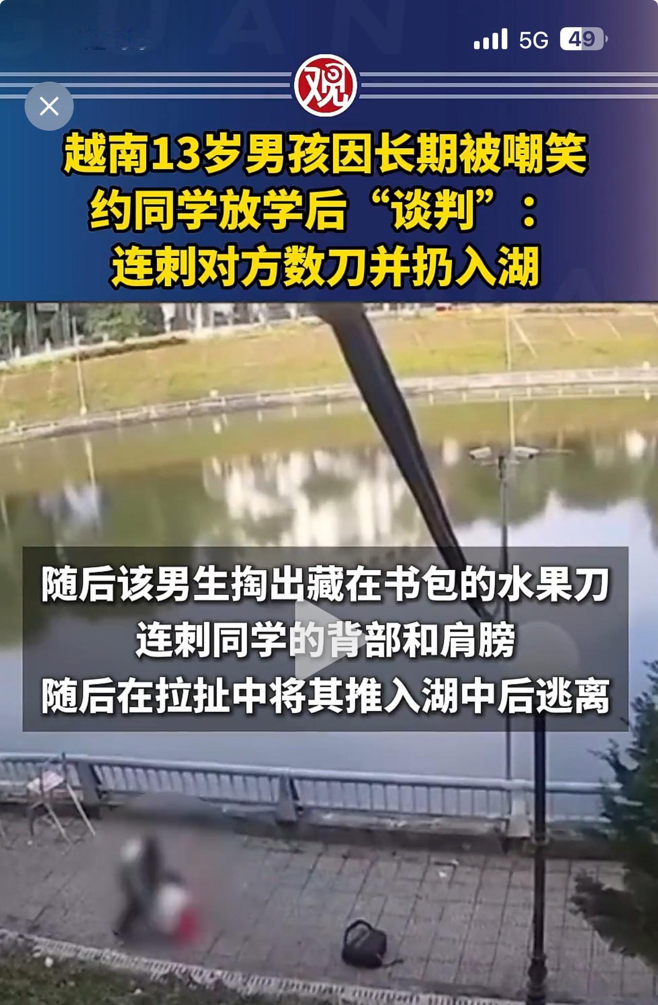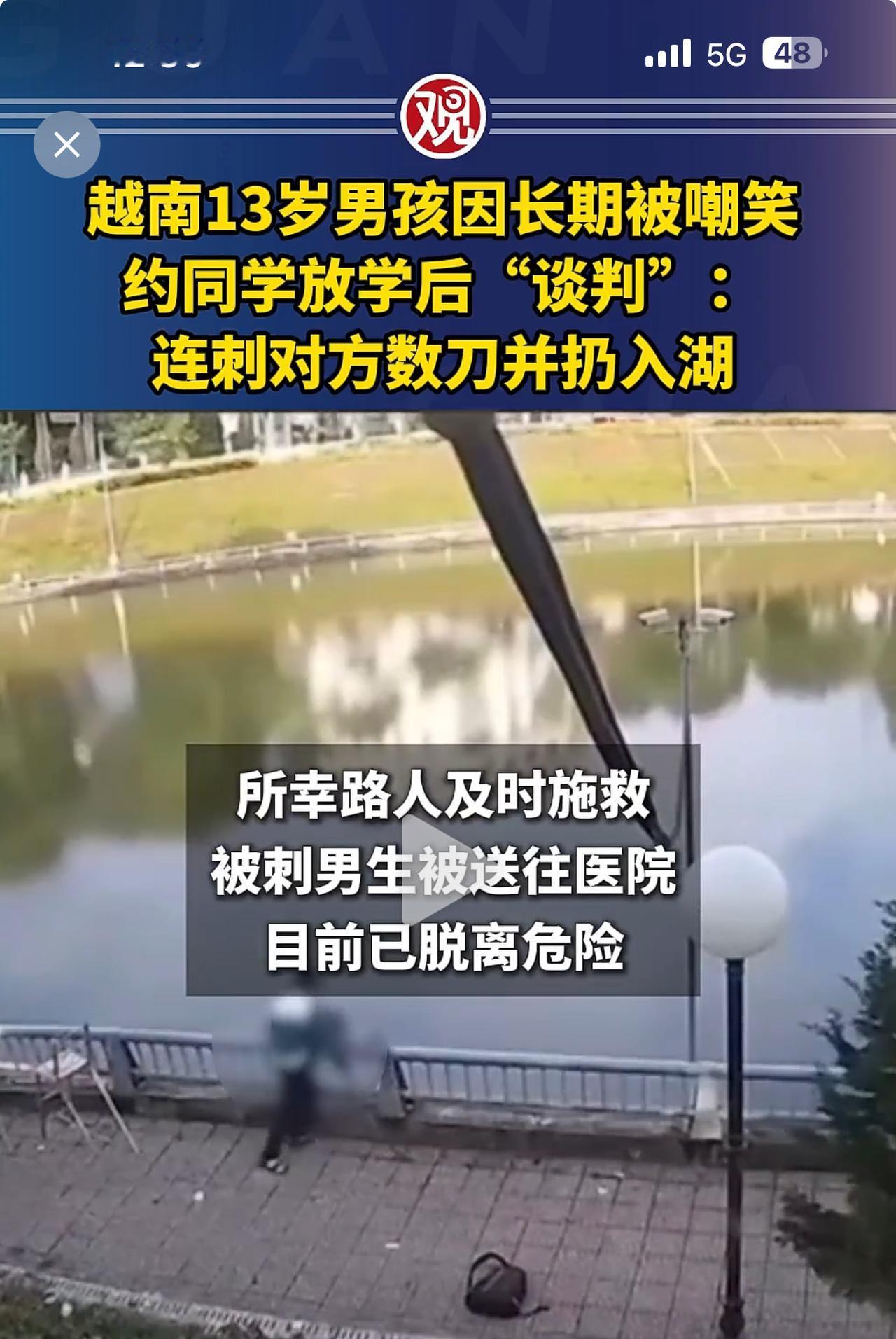不要欺负老实人,老实人的反击将是致命的! 这是发生在越南的事情。13岁男生受不了同学的长期嘲笑,约同学“谈判”不成,把同学刺伤后扔入湖中,后被刺男生被路人救起。 每个人都有自尊心,这种把自己的快乐建立在伤害别人的基础上的人,总有一天自己也会受到伤害! 我想,经过这件事之后,这个欺负他人的男生今后会老实做人。 看了这样的新闻,你有什么想法?身边有没有老实人奋力反击的故事?评论区分享。