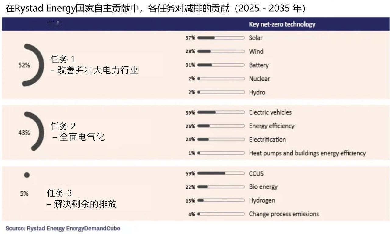 Rystad Energy公司描绘能源转型的真实路径 为了配合第 30 届联合国气候变化大会的筹备工作,Rystad Energy公司对超过 400 份历史及最新提交的国家自主贡献(NDC)方案进行了分析,以评估全球能源系统是否与《巴黎协定》的目标相契合。大多数提交的方案都侧重于电力、能源和交通领域的短期减排,设定了可再生能源和电动汽车普及的明确目标,并为难以减排的行业规划了替代燃料和碳捕获、利用与封存(CCUS)方案。 今年,各签署国正在提交其根据 NDC 3.0 制定的承诺。虽然许多目标看起来更为雄心勃勃,但其中很大一部分反映的是时间表从 2030 年提前到 2035 年的改变,而非任何更有力的政策举措。根据Rystad Energy的评估,最新的 NDC 计划到 2035 年实现与 1.7°C 温度路径相符的轨迹。这些承诺的全面实施到 2035 年有望使排放量较当前水平减少约 25%(10 亿吨)。 根据Rystad Energy的分析,国家自主贡献方案可以通过完成能源转型的三项任务来得以实施: 任务 1 - 改善并壮大电力行业:承诺的减排量中有一半来自电力行业的清洁改造,这凸显了太阳能和风能的迅速发展,以及储能和电网升级的推进。进展符合预期,可再生能源的年度新增量创下新高,但审批、输电和市场饱和度方面的瓶颈问题仍阻碍着部署进程。 任务 2 – 全面电气化:将交通、建筑和工业电气化能够实现到 2035 年实现国家自主贡献目标所需的减排量的 43%。如今,电动汽车在新车销售中的占比已达到四分之一,而五年前这一比例仅为 2%,但其推广规模取决于充电基础设施和政策支持。热泵的使用量也在不断增加,不过在一些地区,高昂的电力价格仍是主要障碍。在钢铁和铝业的早期试点项目表明,工业电气化在中期正逐渐普及。 任务 3 - 清理剩余排放:要解决剩余的 5% 的排放问题,就需要扩大碳捕获与封存、水力发电以及生物能源的应用。这些技术如今已出现在更多的国家自主贡献计划中,并且相关项目也在推进中,但其应用的推广速度远远落后于可再生能源和电气化。要实现长期影响,需要在规模和速度上实现重大突破。 此外,国家自主贡献还创建了“国家自主贡献国家气候承诺相对风险指数”,它提供了一个清晰的框架,有助于更好地理解一个国家全面履行其气候承诺的相对风险。像瑞士、瑞典和芬兰这样的低风险国家(占该指数的 22%)在高收入和政治稳定的基础上实现了电气化和可再生能源的利用。而高风险国家(占 44%),如乌干达、埃塞俄比亚和尼日尔,则面临着结构性障碍,包括低收入、脆弱的治理、低电气化率和不断上升的排放量,这使得其气候承诺的履行变得不确定。三分之一的经济体属于中间类别,包括中国、越南和韩国,在这里工业增长和电气化并存,尽管其能源系统碳密集,但仍展示了快速的技术采用和结构现代化的态势。 总的来说,这些风险特征的多样性凸显了采取协调行动的必要性。主要国家正在引领更具雄心的净零排放计划,这标志着向下一个能源时代迈进的进程。要在这一进程中取得成功,关键在于实现政治稳定、经济的持续韧性以及在脱碳这三项相互关联的任务上取得持续进展。