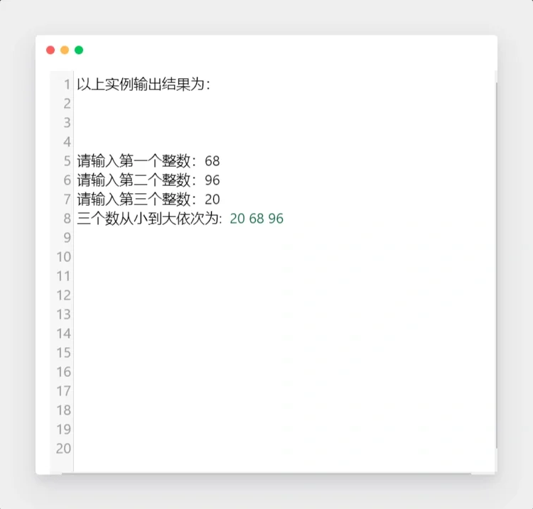 Python经典实例0⃣5⃣ ⭐️题目: 输入三个整数x,y,z,把这三个数由小到大输出。 🌟程序分析: 1⃣先将x与y进行比较,如果x>y则将x与y的值进行交换; 2⃣然后再用x与z进行比较,如果x>z则将x与z的值进行交换; 3⃣最后再用y与z进行比较,如果y>z则将y与z的值进行交换。 🔍其实这个题还有另外一种方法,🉑以通过列表来做,即用一个列表来保存输入的三个整数,然后对这列表进行排序升序再打印输出就🉑以了。 🌹感兴趣的小伙伴可以尝试用我上面说到的这种方法
