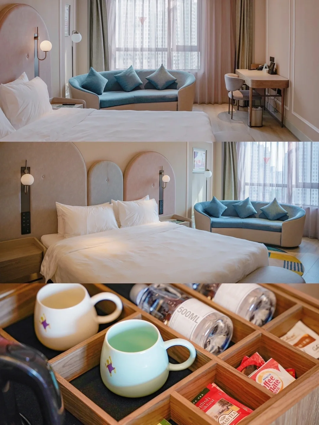姐妹周末来杭州玩,陪她入住一家轻奢风酒店,性价比很高,位置距离浙大紫金港美食街(龙宇街)/大悦城/城西银泰很近逛吃非常方便!房间主打莫兰迪色系视觉很舒适,配有沙发/办公桌/咖啡机/提供免费饮品,适合休闲度假or商务出行的朋友。视野不错,开窗可以看到大运河亚运公园!5楼公共露天泳池夏天可以玩水🏊♀️B1楼酒吧可以夜晚微醺聊天很chill