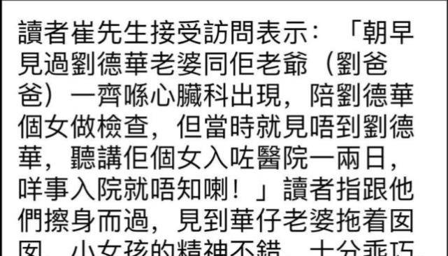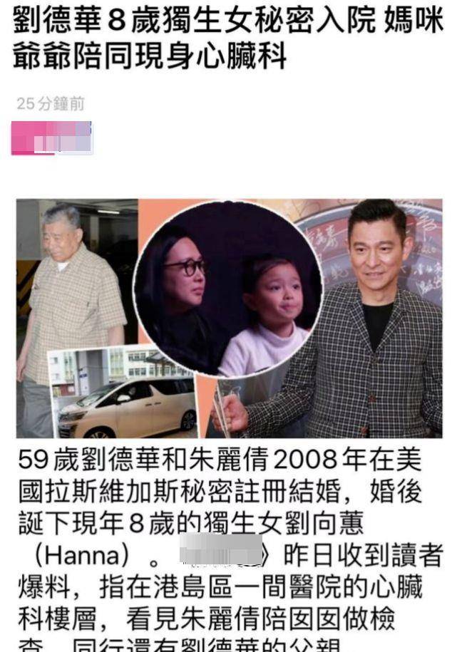 12月3号晚上的时候,香港的媒体爆出了一个消息,刘德华的女儿刘向蕙秘密入院了,她是在妈妈和爷爷的陪伴下来到医院的,这一次竟然现身到了医院的心脏科进行心脏检查,也让许多人不经质疑,才8岁就要进行心脏检查,难道是有什么问题吗?刘德华因为在内地拍戏,所以并没有陪着他们一同前往。