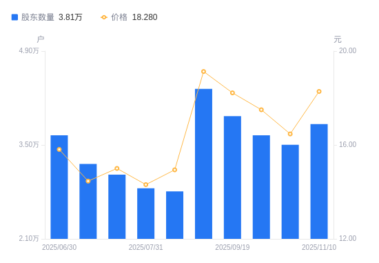 日期A股户数(户)流通A股户均持股数(股)户均持股市值(万元)2025-11-10381095072.799.272025-10-20350315518.519.092025-09-30364315306.449.292025-09-19393024918.818.962025-08-20433584458.678.532025-08-08280696887.2810.292025-07-31285456772.439.692025-07-18305856320.729.482025-07-10321686009.678.692025-06-30364545303.108.38