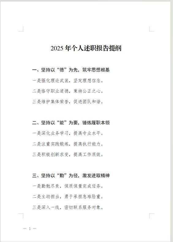 别人年度述职为什么能评优?而我的述职报告却平淡如水,原来问题出在这份提纲上。[流泪] 年底到了,科室小李又在为写个人述职报告而苦恼,这也是许多职场新人都会遇到的问题。“别人的述职时总是成绩一大把,为什么我虽然工作做了不少,写出来的述职报告却很平淡呢?” 我看小李工作勤快,为人谦虚,就点拨他:个人述职报告无外乎是“三段式”、“五件套”,“三段式”就是“主要工作”、“存在问题”、“下步打算”三大段,“五件套”就是写考核的“德、能、勤、绩、廉”5个部分。写好述职报告关键是要善于总结、归纳、提炼,首先要把提纲拟好,让小标题亮起来。” “怎么才能拟好述职报告提纲呢?”小李赶紧请教。我见他好学,就给他点明了:拟提纲如果是硬想、硬写、硬琢磨,就既费神又烧脑,常常费力不讨好。这里有一个小窍门,就是平时收集积累几套好的述职报告提纲,年底要用时,拿出来改一改,直接套用就成,省时又省力,非常管用。 “我到哪里去找好的述职报告提纲呢?”小李又犯愁了。我看他一个新人,平常积累不多,就帮人帮到底,从自己的写作素材库里挑了一套述职报告提纲送给他。小李人很聪明,依照这组提纲填上自己所做工作,述职报告很快就写好了。 果不出所料,在年终述职和民主评议中,小李的个人述职得到了领导和同事的好评,他也在年度考核中被评为优秀等次。小李对我感激有加,我也高兴能帮到他,特别是感到自己这点写作技巧还是很管用的。 现将这套个人述职报告提纲附后,希望在年终述职和评议中也能帮到你。老王出版的新书里还有许多这样的提纲和模板,需要者可联系老王或点击以下链接订阅。职场公文公文写作指导总结 正版 公文写作技巧与范例 王道 著 著 9787521653311