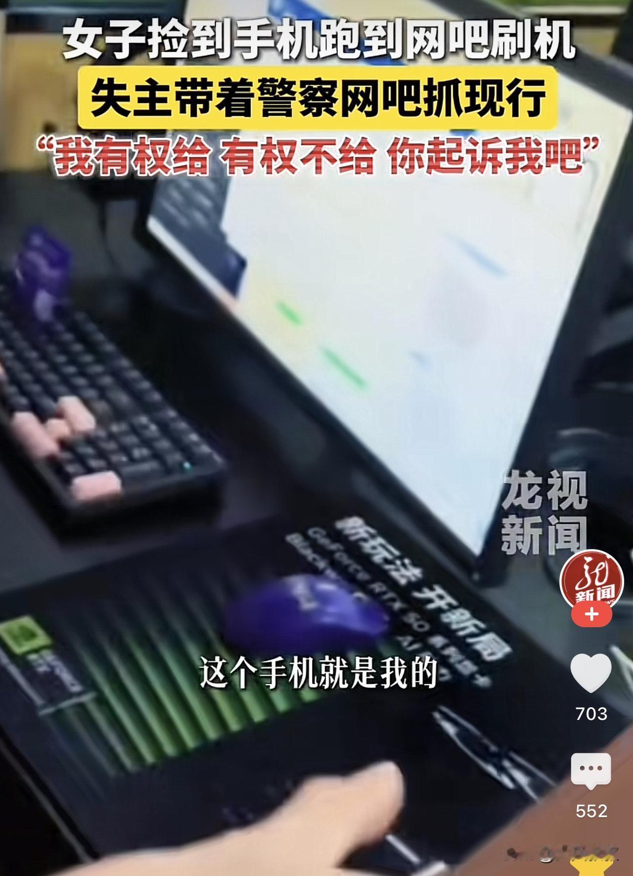 广东,一女子发现手机遗失后便立即报了警,很快民警就找到了捡到手机的人,可是,面对民警的电话,捡手机的人却直接拒绝归还,无奈,女子和民警一起来到了网吧,这时候却发现捡手机的人正在刷机,对此,捡手机的人表示,这是我捡的,我可以归还,也可以不归还。 视频中,一女子称自己丢了手机,被另外一女子捡到之后,捡到手机的这名女子在接到民警电话之后拒绝归还,无奈,民警和失主一起找到了捡手机的女子。 此时,捡手机的女子正在网吧打算刷手机,被失主训斥后,捡手机的女子表示不要在网吧吵,结果失主却表示,你现在知道丢人了吗? 不料,捡手机的女子竟然理直气壮的称,我可以有权给,我也有权不给。 事发后,有网友说,不一定要怪人家捡到的人,我以前捡了个钱包,用了三天才联系上失主,结果人家说钱包里有钱,说里面的钱是我拿走了,非要我赔偿,当时闹了很久,民警也解决不了,我气的直接把钱包又给扔河里了。 还有网友说,如果东西是放在公共场所桌子上,人离开一会上厕所,被人拿走了,这就不是捡是偷了。 还有网友说,人家说的没错,可以不还,你可以去起诉,没毛病。 其实,因为法律上规定的侵占罪,要求的条件比较高,不仅要求失主直接起诉捡手机的人,而且,手机的价值要达到较大标准,也就是一万元起步,才算是较大标准,这和盗窃金额,诈骗金额相差巨大。 如果是盗窃,可能盗窃1000元就构成犯罪,但是,如果捡到手机不还,手机必须要达到1万元以上,才能够立案,而且还要失主自己起诉,所以,目前法律框架下,对失主的救济并不是太友好。 但是,在民事层面,捡手机是必须要归还,或者是必须交给有关部门的,如果不交占为己有,那么失主也是有权起诉要求归还的,如果因为故意或者重大过失,导致了手机灭失的,那么,捡手机还负有赔偿的责任。 当然,如果捡手机的人极力寻找失主,最终找到了失主,这个时候,捡手机的人,是有权向失主索要一定补偿的,而且这也是法律规定的,即可以索要必要费用,不过遗憾的是,对于数额多少,法律并无明文规定,即到底是按照手机价格10%还是20%支付补偿,这并无规定。 不管如何,拾金不昧是我们的传统美德,希望这种美德能够延续下去,而不要被这种极少数人带坏。 对此,你对本案有什么看法? —————————— 关注我,带你评析法律热点,关注冷暖人生。 文章原创,抄袭必究