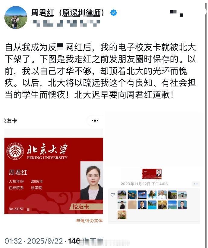 “中国越制裁我,我就越反华!”今年3月,百万粉丝的女网红于国外屡屡诋毁中国,受出入境管控,全家被殃及,谁知她竟声称要变本加厉地“反华”,     周君红原本是深圳的执业律师,专打刑事案子,按理说,律师该是维护公平正义的,可她倒好,专爱钻法律空子,她曾帮一个贩卖400公斤冰毒的大毒贩辩护,通过伪造“重大立功”情节,硬是把死刑改成了死缓。   2020年,她突然转行当起了“反华网红”,为啥?因为钱多啊!她在海外平台疯狂发抹黑中国的帖子,一天能发20条动态,一周写万字长文,一个月拍三部“揭露中国黑暗”的视频,比流水线工人还拼。   她编的谣言五花八门:什么“中国司法迫害律师”“新疆强迫劳动”“中国疫情数据造假”……只要能博眼球,她啥都敢说。   更恶心的是,她还把“反华”当成生意做,她开课教人怎么写“人权报告”,教人怎么翻墙,甚至花钱雇东南亚的群演拍伪纪录片,比如她拍“新疆棉农被强迫劳动”,结果网友发现拍摄地根本不在新疆,群演说的方言也露馅了。 周君红的“反华生意”刚开始挺红火,海外平台给她打钱,粉丝给她点赞,她觉得自己找到了“财富密码”,可谎言终究是谎言,迟早会被戳穿。   国内司法部门很快注意到了她,直接吊销了她的律师执照,银行一查,发现她账户里钱来路不明,直接冻结,她家里老人因为她的极端言论,在小区里被人指指点点,连退休金账户都被监控了,海外“金主”也不是傻子,发现她流量造假、内容低劣后,立马撤资。   这场闹剧告诉我们:靠造谣抹黑祖国赚流量,迟早会遭报应,你编的谎言越多,被揭穿时就越丢人,周君红现在就像个网络乞丐,没人同情她,只有无尽的嘲笑。   周君红不是第一个靠“反华”博眼球的网红,2025年6月,意大利网红卡比·拉梅因为签证逾期被美国拘留,虽然最后“自愿离境”避免了强制遣返,但她“特权争议”的事也被网友骂得够呛。   相比之下,周君红的结局更惨,她不仅违法,还背叛了培养她的土地。   现在有些网红,为了流量啥都敢干,他们觉得“黑红也是红”,只要有人关注,管他是骂还是夸,可他们忘了两件事:第一,网友不傻。   你住豪宅、开豪车,却在网上哭穷卖惨,谁信啊?第二,国家有底线,《律师法》《出境入境管理法》这些法律,不是摆设,你触碰了红线,就得付出代价。   更可笑的是,有些人以为“反华”能换来西方青睐,可看看周君红、许秀中这些人的结局:当他们没利用价值了,西方媒体立马翻脸,甚至落井下石。   真正的尊严,不是靠诋毁祖国获得的,而是通过建设性批评推动社会进步,你吃中国的饭,却砸中国的锅,最后只会饿肚子。 周君红这事,说白了就是流量经济下的产物,现在有些人,为了赚钱连良心都不要了,他们觉得,只要能在网上火,管他是正面还是负面,可他们没想过,靠造谣抹黑祖国赚的钱,花着能安心吗?   网友的辨别力越来越强了,你编的谎言再高明,也会有人戳穿,周君红以为自己能骗过所有人,结果被网友扒得底朝天,她现在成了全网笑话,这就是没底线的代价。   还有那些幻想“反华”能换来西方青睐的人,醒醒吧!西方媒体只会利用你,当你没价值了,他们连看都不会看你一眼,真正的强者,是靠自己的能力赢得尊重,而不是靠诋毁祖国。