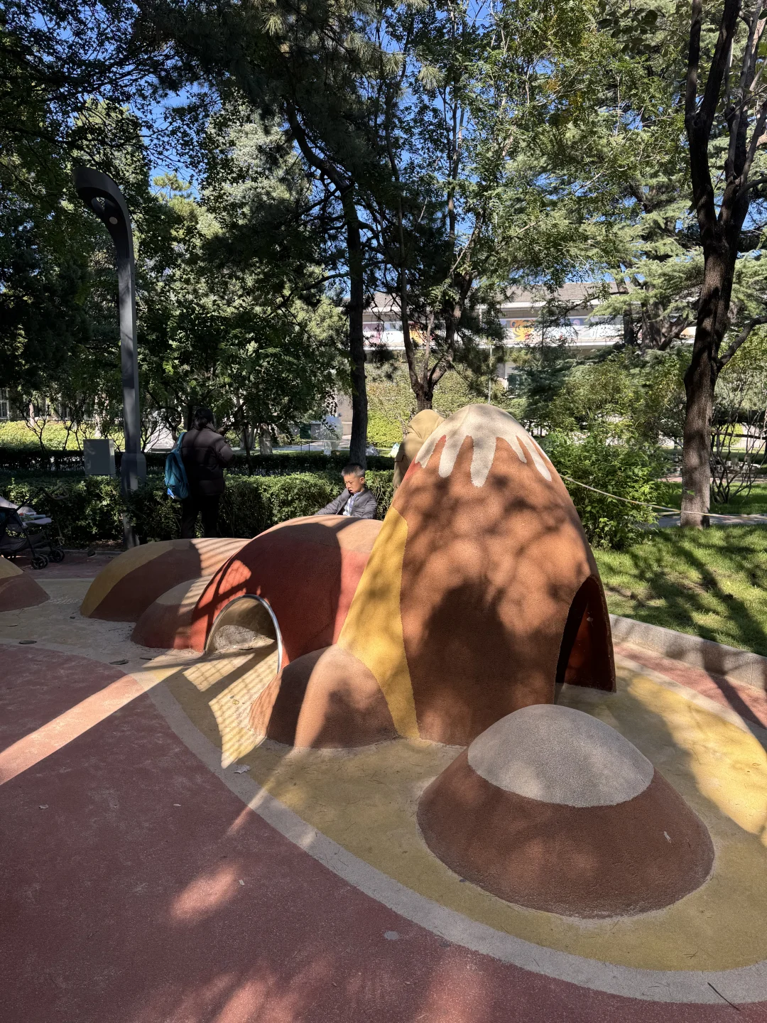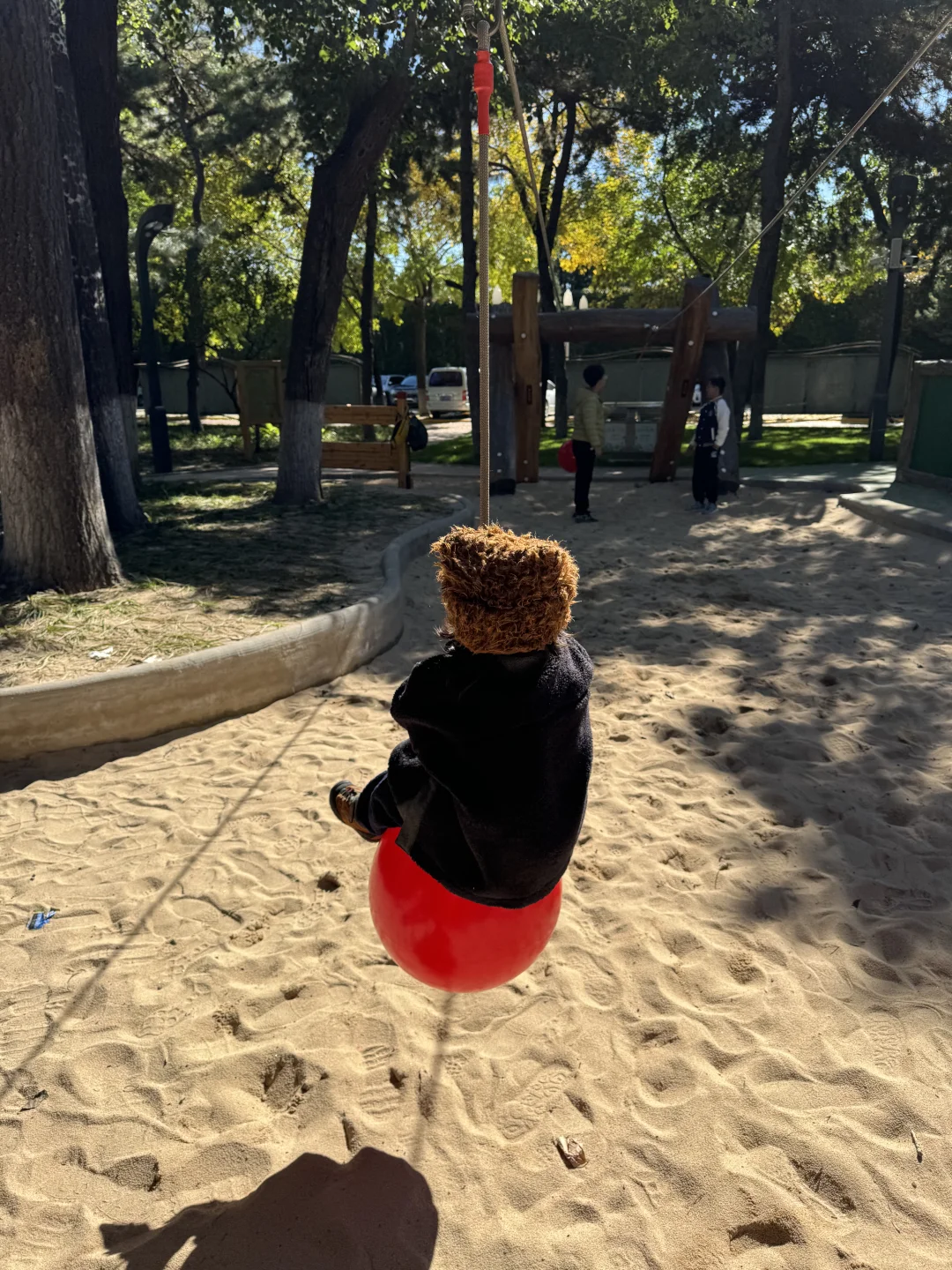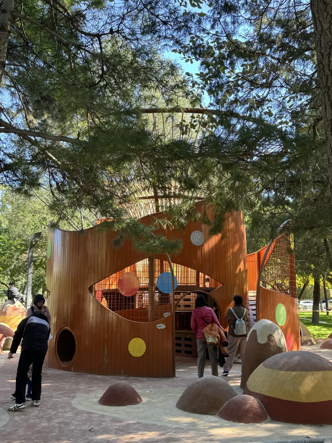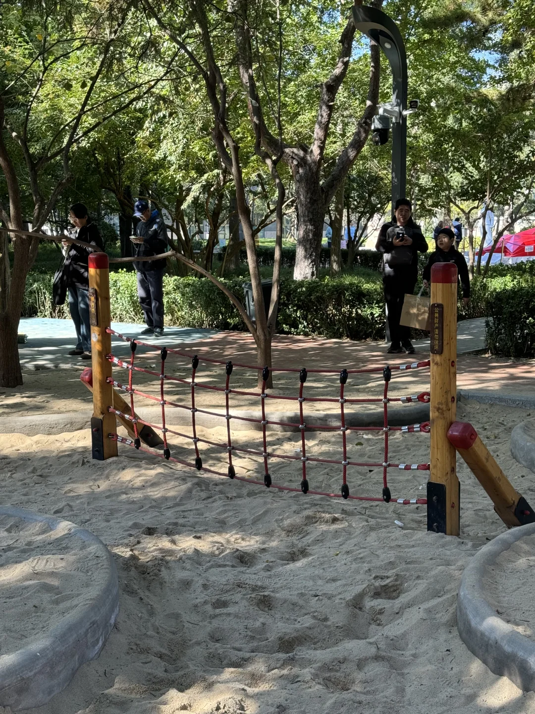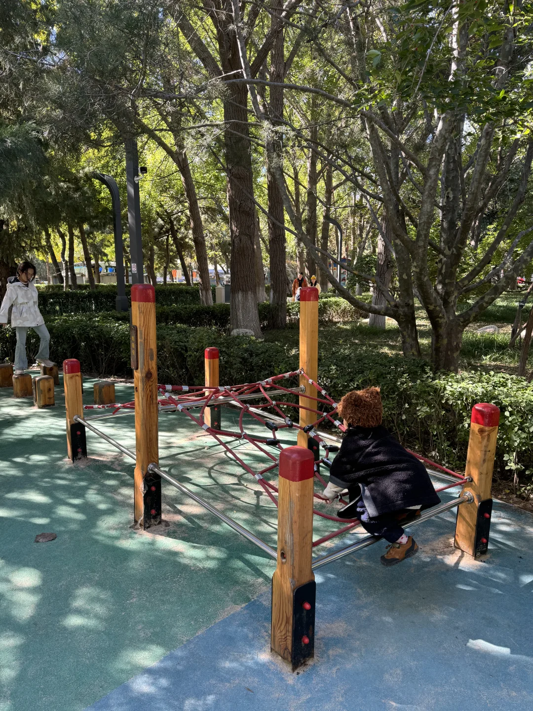 攀爬架,滑梯,滑索,沙池,木桩攀岩,树洞,应有尽有,足够玩。