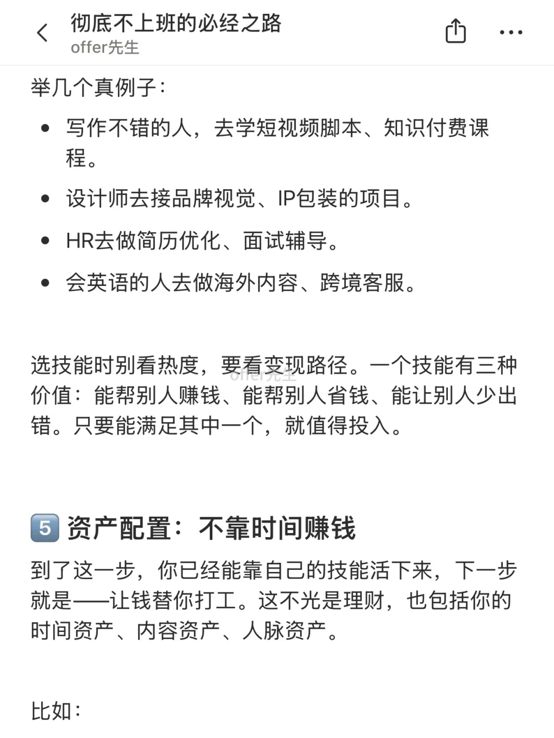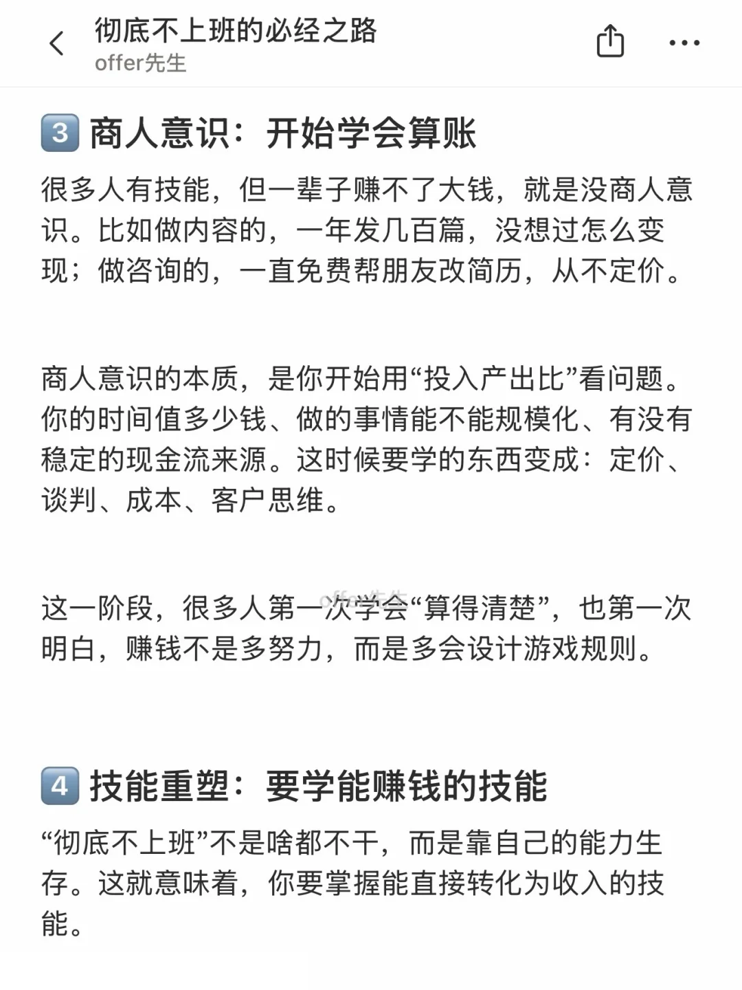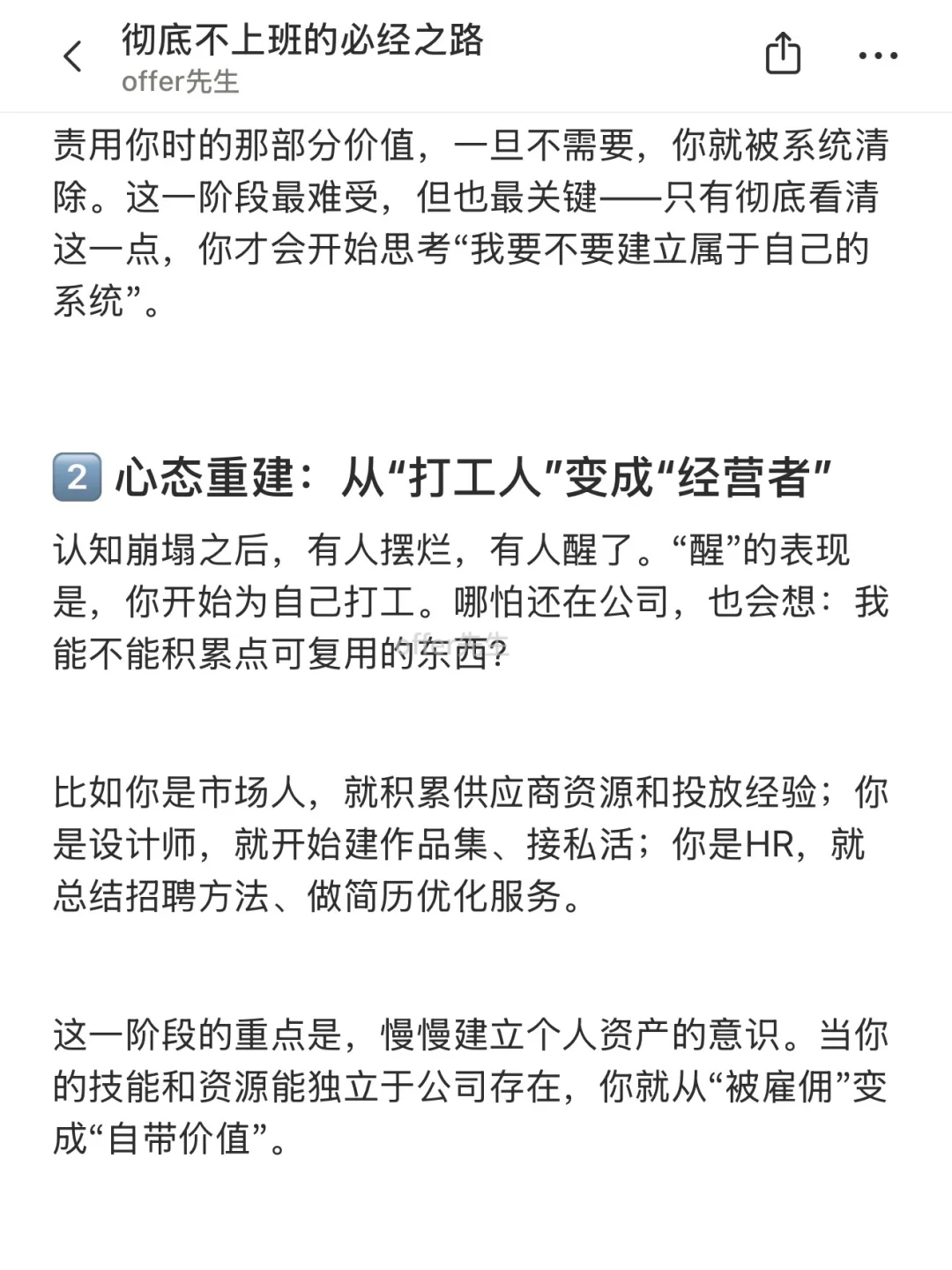 这刷到一段话挺有意思的——“彻底不上班的人,大多都经历过五个阶段:认知崩塌、心态重建、商人意识、技能重塑、资产配置。” . 细细想了一下,其实挺真实的,如果你真想以后不靠打工活着,这五个阶段一个都绕不过。 . 一个认真分享“找工作”干货的账号。真诚、有料、不说空话,只想用真实经历、具体方法,帮大家少走点弯路 .