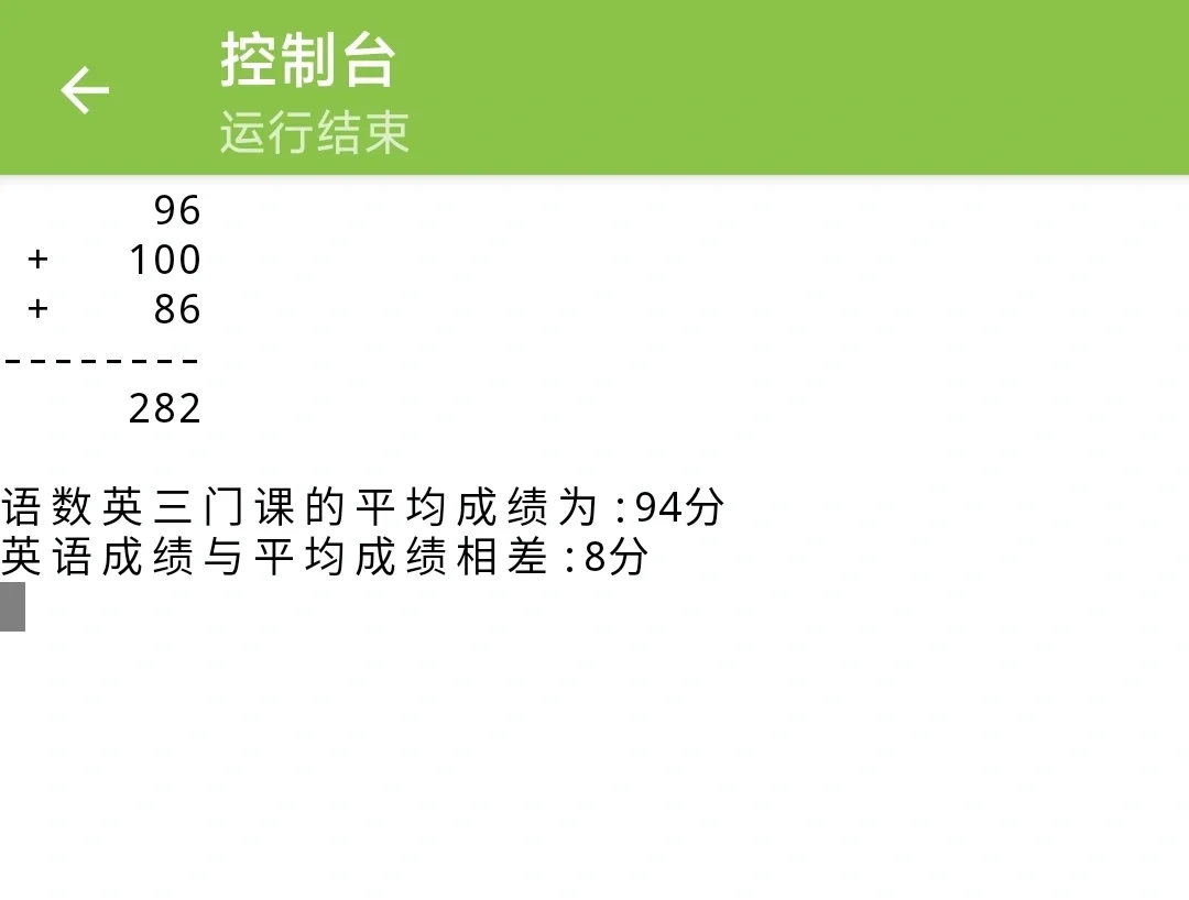 大家好[微笑R][微笑R]我是柠檬🍋 今天给大家分享一个c++基本数学运算的小案例 ~ ⭐️题目: 已知Mary的语文成绩为96分,数学成绩为100分,英语成绩为86分,用变量保存各科成绩,计算三门课的总成绩(用竖式展示计算过程),然后输出三门课的平均分(不考虑小数点),并输出英语成绩与平均分相差多少分。 ~ 🌟输出效果如下: (展示竖式计算运算过程) 语数英三门课的平均成绩为:94分 英语课与平均成绩相差:8分 ~ 💥我在用c++做这道题的时候觉得好玩便分享了一下 ~
