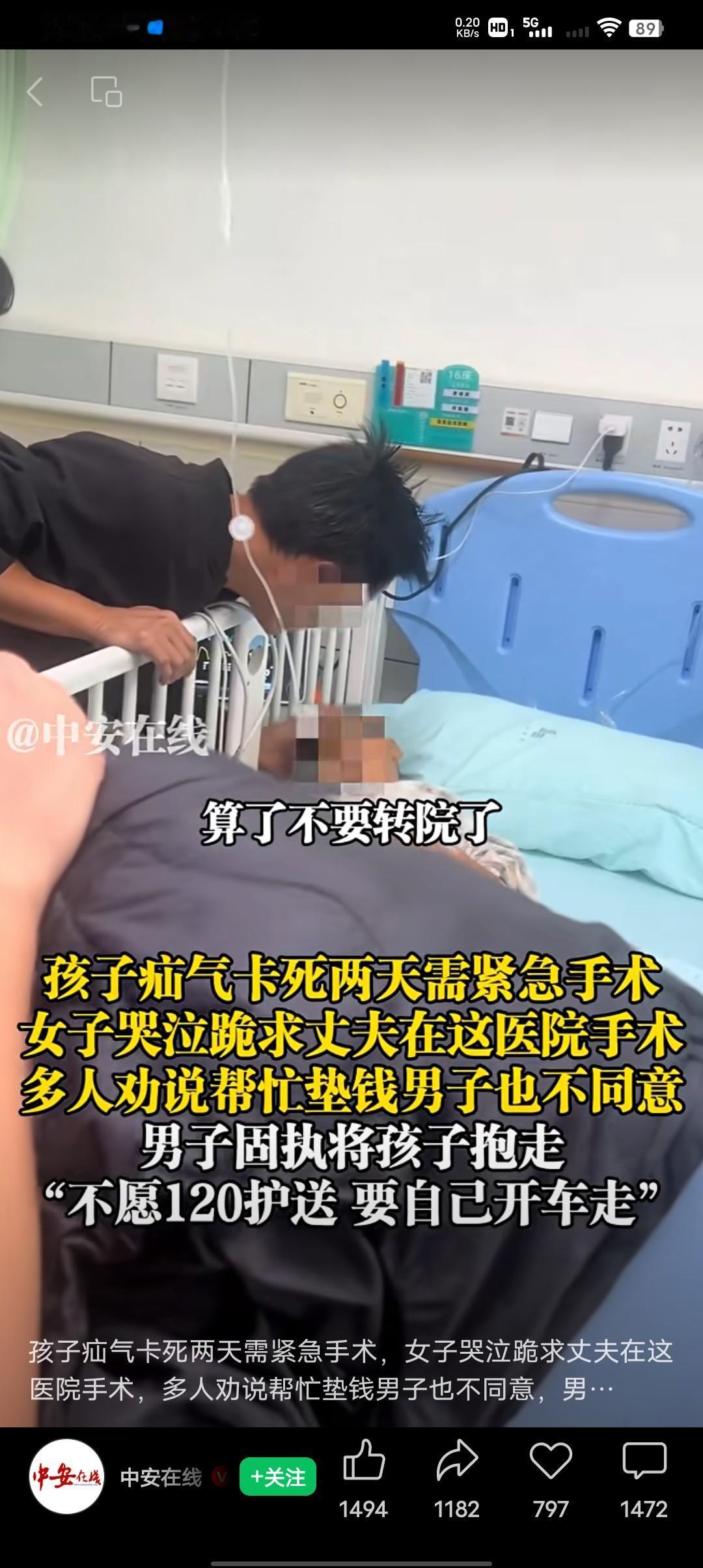 孩子疝气卡死两天了,急需手术签字治疗,可爸爸死活要转院,还不让120急救护送,坚持自己开车走。并拔掉了孩子的氧气管,坚持去中医院看看。一旁的医生护士都说这是妇幼医院,最适合妇幼病情的医治了。 众人怎么都拦不住,孩子妈妈哭着跪地求就在这个医院给孩子手术。看中人祖蓝男子放下狠话我孩子有个闪失我砍了你们。众人以为这个爸爸没钱,有人答应给垫付医药费,这个爸爸还是固执的抱着孩子走了。疝气应该是个小手术吧!为什么男子反映会这样大呢? 有人说,男子肯定是看了某些视频怕孩子出事所有才坚持去其它医院看看的,也有人说,这个做父亲的做事太极端了,一旦耽误病情后悔都来不及。 怎么看都觉得这个男人做事不太靠谱,病情不等人的,有些病情晚几分钟就会没命的。