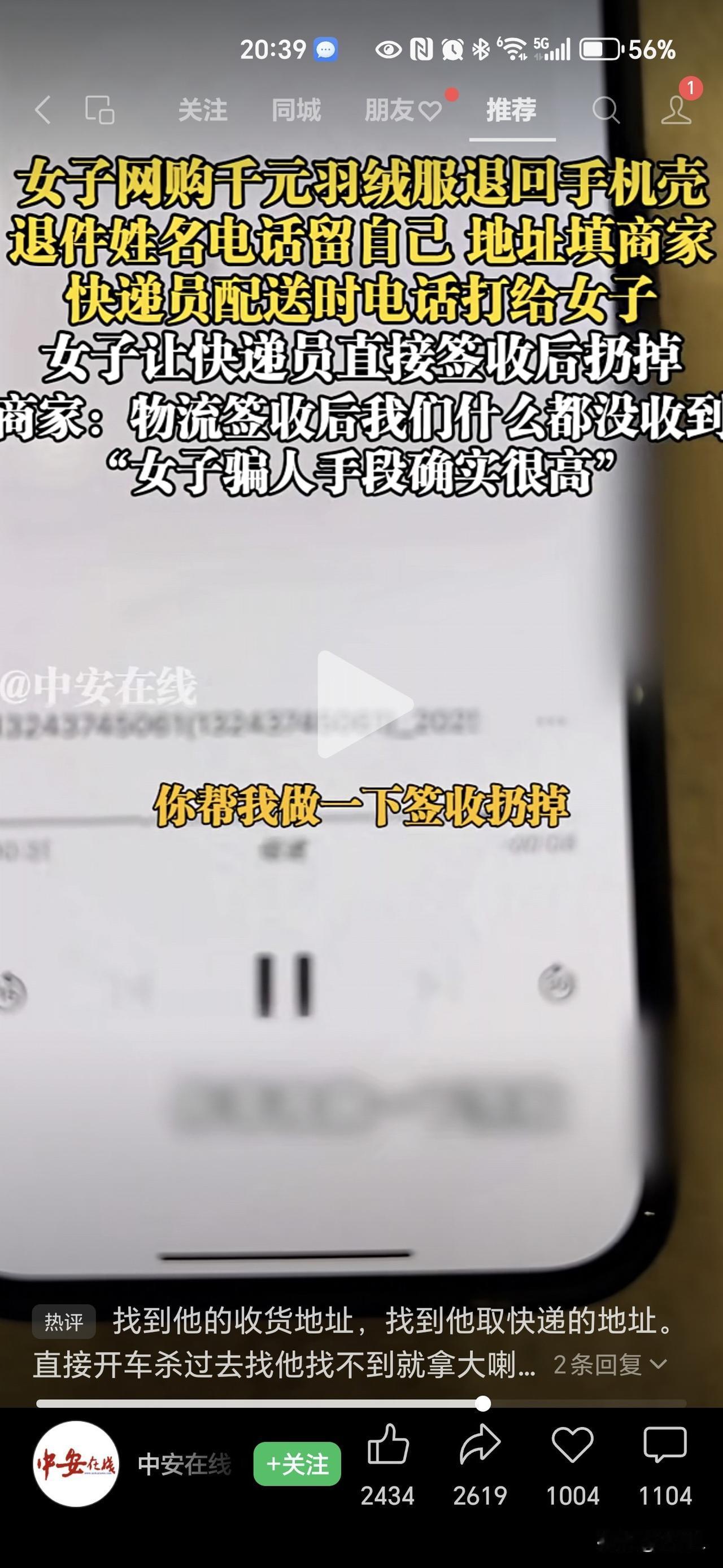 “狸猫换太子”升级版!新型“空包退货”骗术曝光:她填自己电话,用顺丰快递,精心设计只为坑一件羽绒服! 千元羽绒服退货,里面竟是个手机壳!她远程指挥快递小哥“签收扔掉”,结果…… 见过退货骗局,没见过这么“费尽心机”的! 近日,云南的张女士在河北某商家的线上平台,购买了一件千元羽绒。 女子收货后,做7天无理由退货处理。然而,这个退货包裹却暗藏玄机。 “狸猫换太子”:羽绒服秒变手机壳。 女子接下来的操作,更是堪称一绝! 在填退货信息的时候,女子选择自行退回,退货地址是商家的,但是退货收货人和电话,用的却是她本人的,并且是采用顺丰快递。 为什么采用顺丰呢?一般网络退货用顺丰的比较少,因为顺丰贵啊。但是顺丰派送之前是要先打电话跟客户沟通,再进行派送的。 就这个原本应该是负责的行为,被女子视为漏洞。 果然,退货到了河北后,顺丰小哥按照系统里收件人的电话,也就是张女士本人,打电话沟通送货。女子直接跟小哥说,“你帮我签收后扔掉就行。” 她企图利用快递公司的合规流程,制造一个“已签收即完成退货”的既定事实,让商家钱货两空。 小哥反复跟女子确认,女子都坚持要小哥确认后扔掉。小哥觉出异常,全程录音,按照客户要求做了签收,但东西没有扔掉,而是妥善保管。 等商家处理退货时,发现了这笔已签收的退货订单,但却没有找到退货的羽绒服。 当商家联系顺丰小哥时,小哥提供的完整录音证据,瞬间揭穿了这场精心策划的骗局。 目前,商家已向平台提交了证据来维权! 这位自诩聪明的张女士,恐怕不仅要照价赔偿,还可能登上平台的信用的黑名单,真是偷鸡不成蚀把米! 天网恢恢,疏而不漏。莫耍小聪明,诚信才是最大的智慧! 信息来源于中安在线,侵联删! 带定位晒今日生活 我的今日状态:😁轻松愉快 我这里的天气:☀️晴天