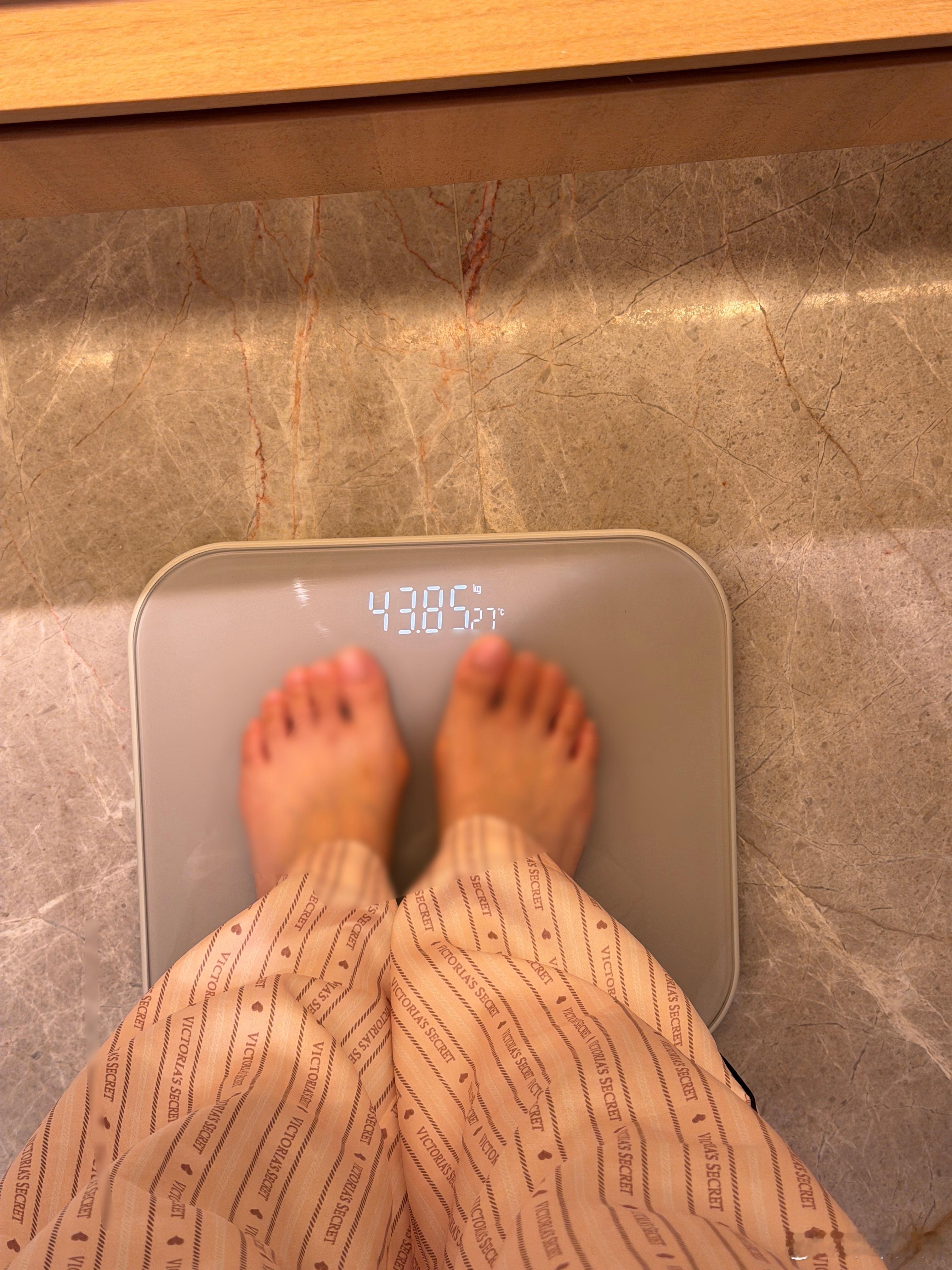刚才上称43.85kg,整体上比我前段时间瘦了,晚上不加餐确实有效!不过还是要有氧运动!希望再坚持减到40kg!!!回到我之前的体重!!!