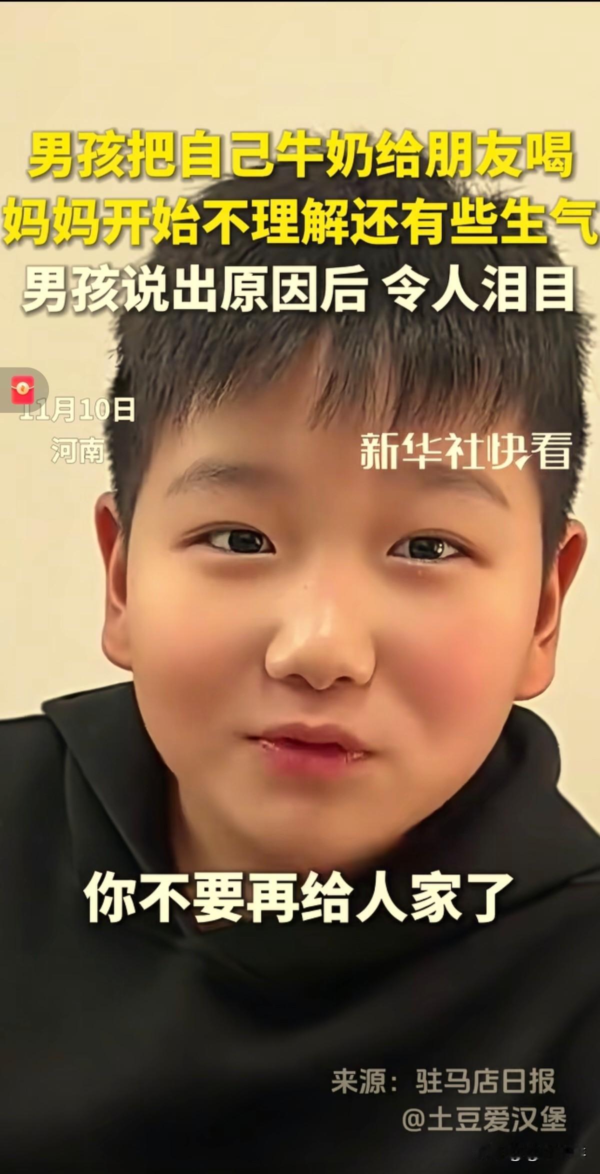 偶然间刷到这个视频,看完后瞬间热泪盈眶!河南,妈妈发现儿子的行为有点反常,给他买来的牛奶他一盒也没有喝着,但是他每天依然风雨无阻的将牛奶带到学校去。妈妈非常的纳闷,忍不住问儿子,儿子的回答让妈妈瞬间哽咽了...... 原来妈妈给儿子买的牛奶,虽然儿子都带去学校了,每天一盒,每盒都给了班里的一位同学。妈妈发现后觉得不可思议,就猜想:难道是儿子被欺负或者霸凌了,怎么也没有听儿子回家说过呢? 趁着晚上吃饭的空隙,妈妈直接开门见山的问儿子咋回事? 儿子听了转过头天真回答:“是我自己愿意给的。” 妈妈难以理解的说:“这是我给买的牛奶,他有自己的妈妈给他买的呀......” 没有想到,儿子低声对妈妈说:“可是,他没有妈妈......” 这一刻,妈妈惊呆了,嘴巴张开没有说出一句话,眼泪落了下来。 妈妈瞬间觉得儿子长大了、懂事了,这样的行为妈妈必须支持。 安静了好一会儿,妈妈平复了心情,转头对儿子说:“从明天开始,你就每天带2盒去学校吧,你们一人一盒。” 本以为事情就这样结束了,没想到儿子突然加了一句话:“妈妈,我能不能每天带三盒去学校呢?” 妈妈吃惊道:“为什么要带这么多?” 儿子对妈妈说:“他还有个妹妹,我每次带去的牛奶,他都舍不得喝,都拿去给他妹妹喝了,所以我想多带一盒给他们都尝尝牛奶......” 听完儿子的回答,妈妈再次红了眼眶,眼泪再次打湿了脸。这份超越血缘的温暖,在很多的大人身上都没有办法做到的事情,自己的儿子却做到了,这份温暖彻底暖了那对兄妹的心。这一刻,她忘记了对儿子说点儿什么,心里默默支持儿子。 她暂停了一会儿,哽咽对儿子说:“好好好......” 此视频发到网上,迅速引发热议,64万网友点赞,1.6万网友评论:抛开成绩不谈,这孩子的善良已经胜过一切了。 一杀:“他没有妈。” 二杀:“他还有个小妹。” 还有一个妈妈支持的同学给他们兄妹带牛奶,这幅画面太有杀伤力了,真的让人感动哭了。年纪小小的他做到了意义很大的事情,太棒了! 究竟是什么样的家庭才能养成这么善良的孩子呀?他的爸爸妈妈一定非常的优秀善良吧。我们很多人埋怨自己不会教育孩子,但父母的言传身教才是对孩子最好的榜样,善良不分年龄的大小! 人们常说“吃亏是福”,但是孩子的这份纯粹的善意告诉我们,有时候吃亏真的是一种福报,无论何如你都要怀有一份善良。 我以为这位妈妈会责怪孩子,没想到和儿子的细心沟通后,转而支持孩子的善良。孩子的善良需要得到父母的认可和支持,这样温暖的教育,才能教育出这样优秀的孩子!爱,让这个世界更加温暖!