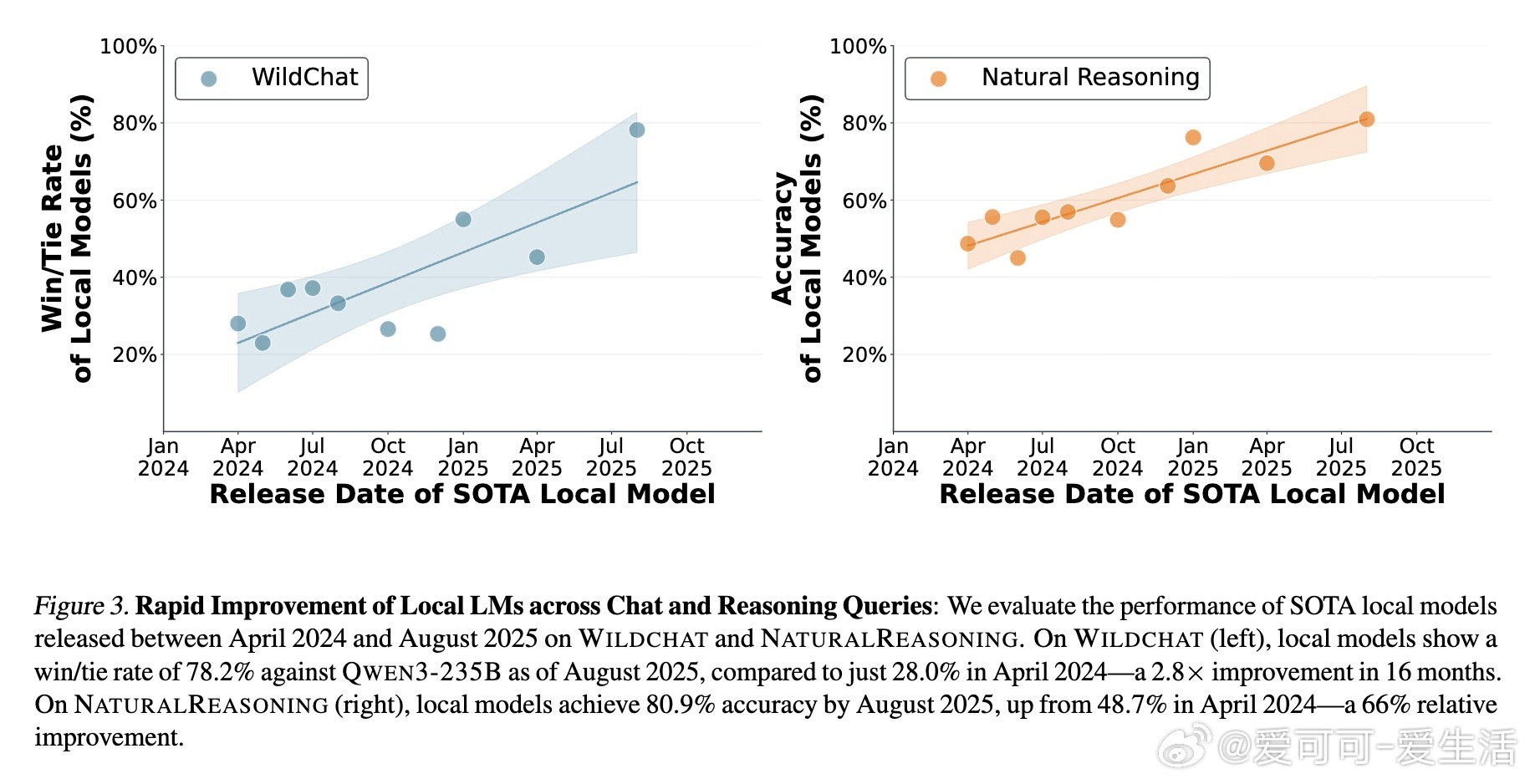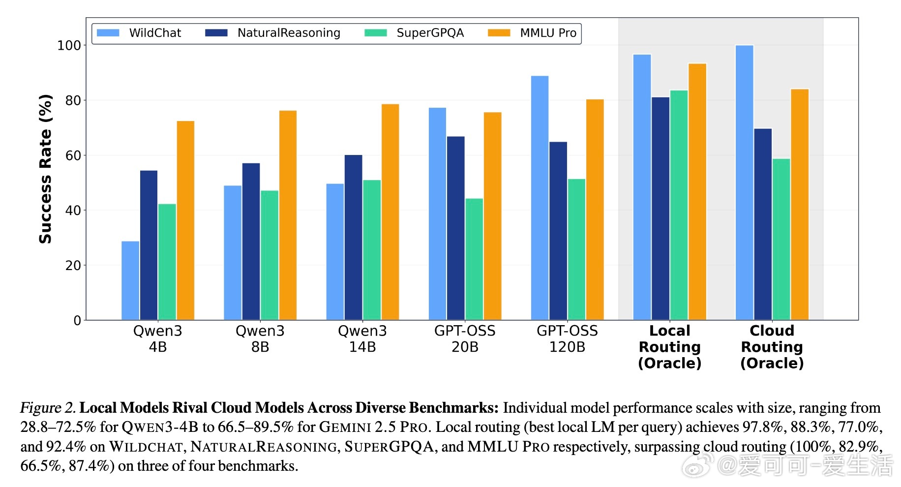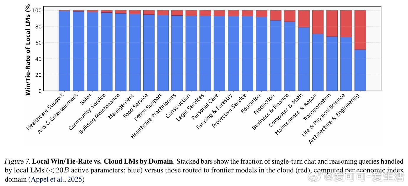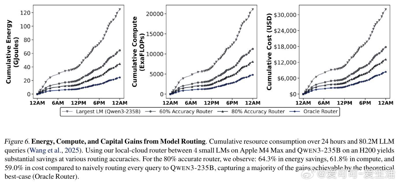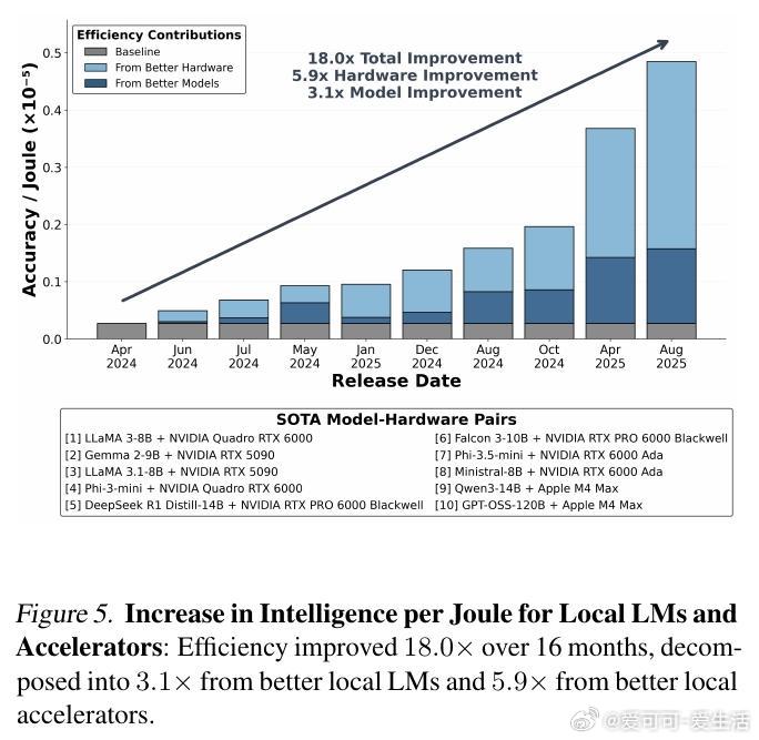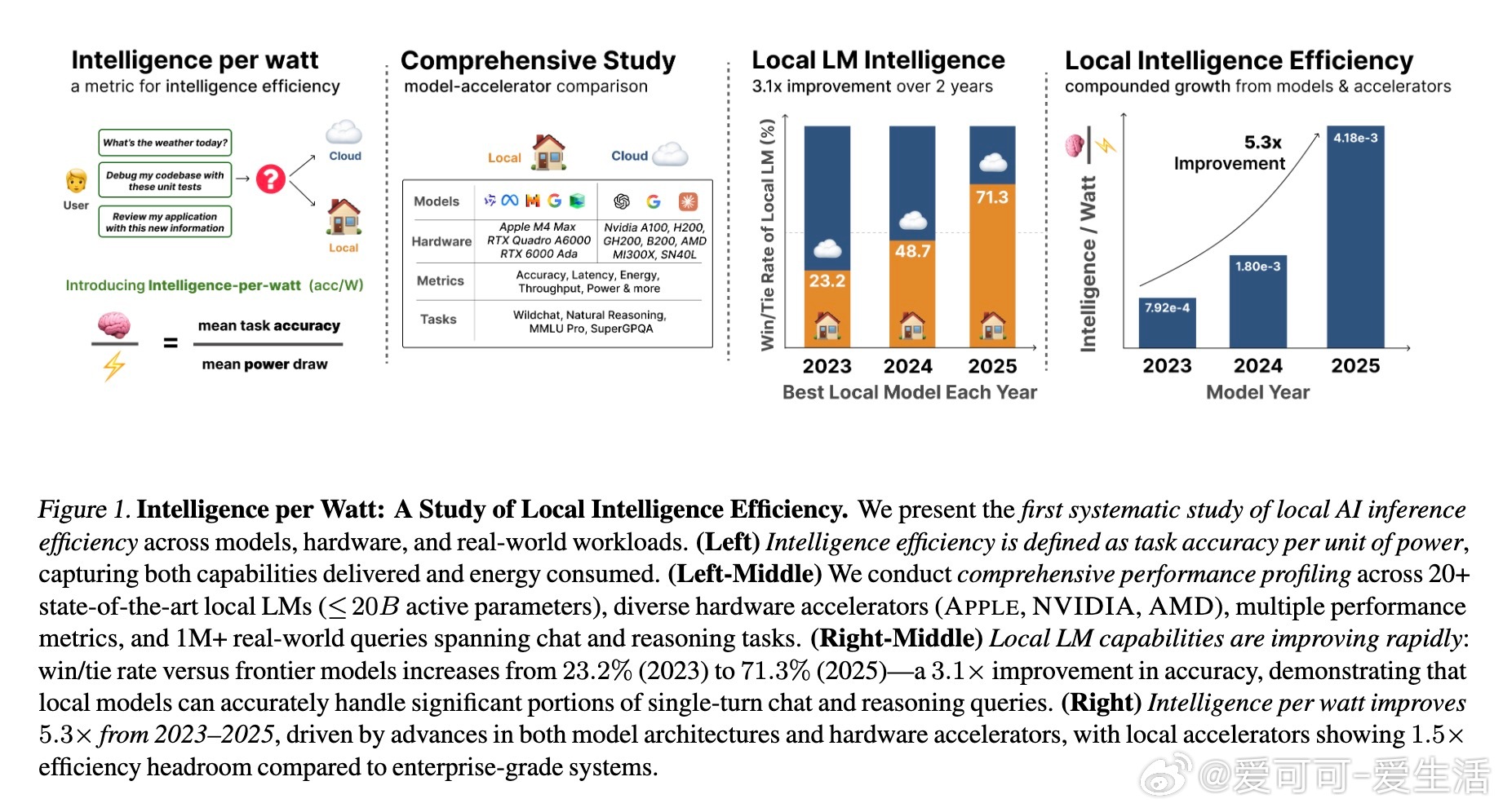 [LG]《Intelligence per Watt: Measuring Intelligence Efficiency of Local AI》J Saad-Falcon, A Narayan, H O Akengin, J. W Griffin... [Stanford University] (2025) 随着大语言模型(LLM)推理需求爆炸式增长,传统集中式云计算面临资源瓶颈,扩展难题日益突出。近期两大技术进步为本地推理带来曙光:一是参数规模不超过20B的小型本地语言模型(如Qwen3、Llama3.1、gpt-oss)已能在多任务上与云端前沿模型媲美;二是本地加速器(如Apple M4 Max、AMD Ryzen AI)具备运行这些模型的算力和内存,支持交互式时延。那么,本地推理能否有效分担集中式基础设施的压力?关键在于评估本地模型的回答准确率和在电源受限设备上的能效。本文提出“每瓦智能度”(Intelligence Per Watt, IPW)作为统一指标,衡量单位功率下模型的任务准确率,融合了能力与能效两大维度。通过对20余款本地模型、8种硬件加速器,以及超过100万条真实单轮对话和推理查询的实证分析,研究揭示:1. 2025年,本地模型能准确回答88.7%的单轮查询,覆盖面随领域不同而异。创意类任务(如艺术传媒)准确率超90%,而技术领域(建筑工程)则降至约68%。2. 2023至2025年间,IPW提升了5.3倍,得益于模型架构与硬件加速器的协同进步。本地服务的查询覆盖率也从23.2%飙升至71.3%,显示本地推理可处理越来越多实际需求。3. 本地加速器的IPW比云端加速器低约1.4倍,表明本地硬件仍有巨大优化空间。此外,智能路由机制能显著节省资源:即使路由准确率为80%,也可实现约60%的能耗、算力和成本节约,同时保持答案质量。这些发现表明,本地推理不仅是云计算的有效补充,更是推动AI基础设施可持续发展的关键。随着技术迭代,IPW将成为衡量本地推理转型进展的重要标尺。我们同时开源了IPW性能分析工具,支持社区持续基准测试,推动本地模型与硬件的协同优化。——详细报告请见:arxiv.org/abs/2511.07885