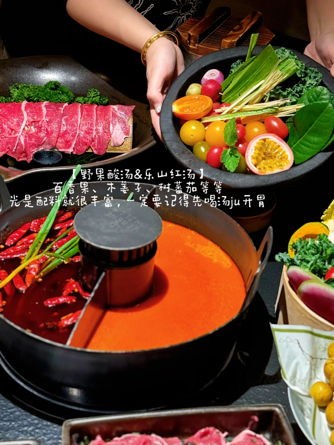 ✔️汤底我们选的是经典款【野果酸汤&乐山红汤】,各种果蔬放进酸汤里,味道很浓郁属于越煮越有滋味,红汤的辣味🥵绝对够!但是那种辣而不燥🔥!!