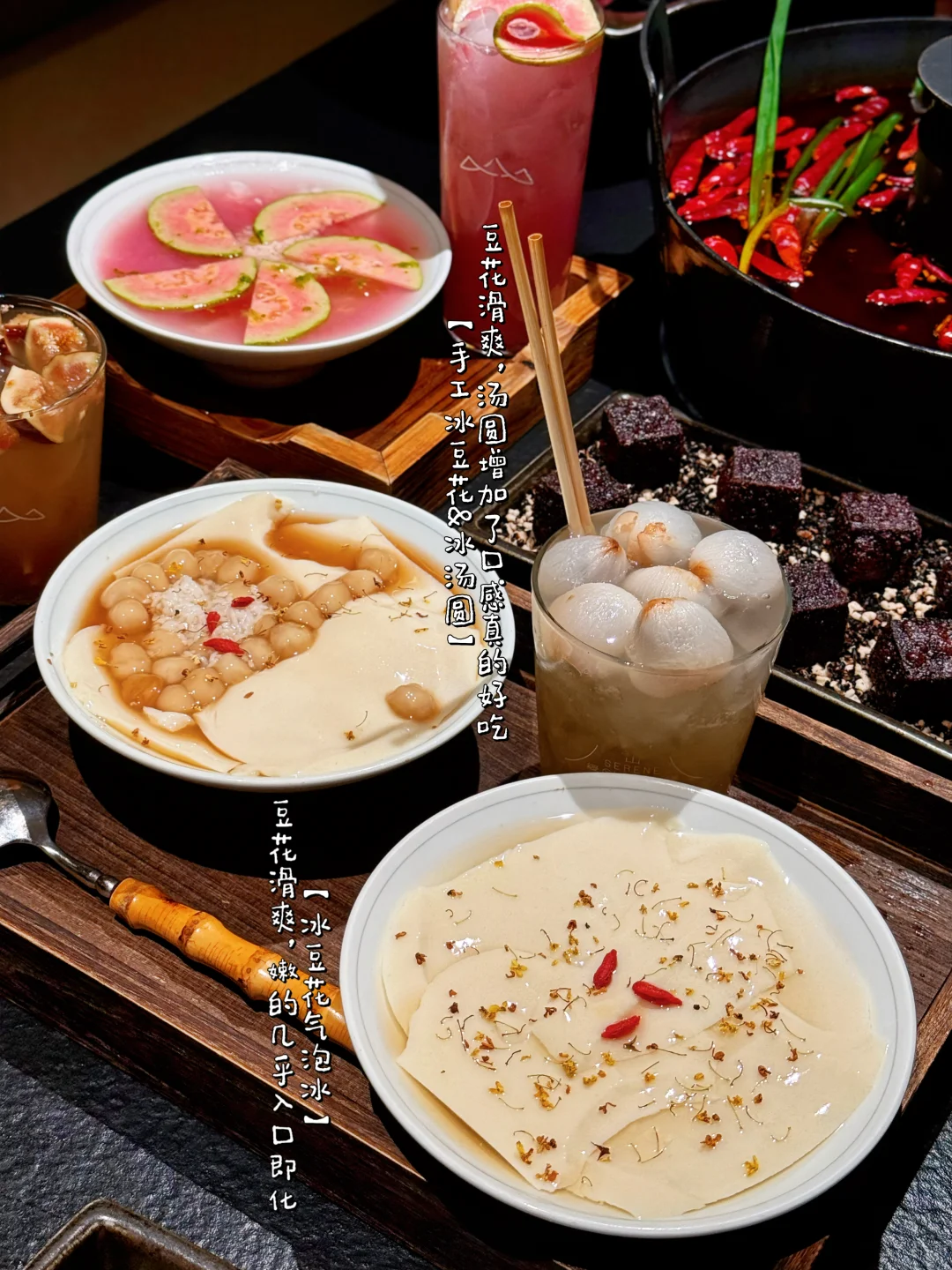 ✔️先说甜品!芭乐酒酿冰粉、冰豆花气泡冰粉、手工冰豆花&冰汤圆,每一款都是解辣神器!吃起来清爽不甜腻!