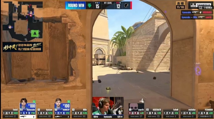 第三局FURIA直接提速抢了中路身位,NiKo拱门卡位置逮捕了FalleN!FURIA进攻也脱节了,自己雷包被打掉之后kyousuke从B小回防不给机会!三杀收尾!FALCONS三个局点!15-12!