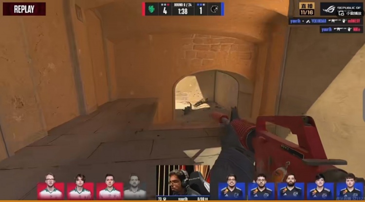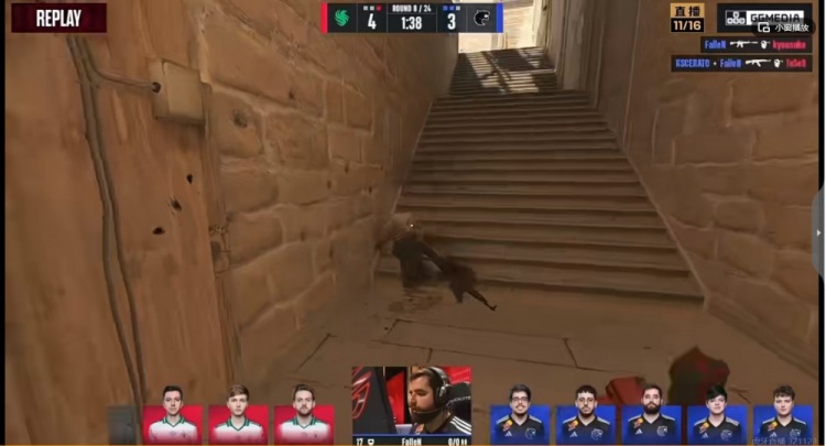 第四局FURIA占据中路,FALCONS反清正好错了个timing,FURIA两人残血但是人数是2换3的优势位置!残局kyxsan换位置正好被抓timing!m0NESY从B小回防直接被拱门逮捕!8-8!