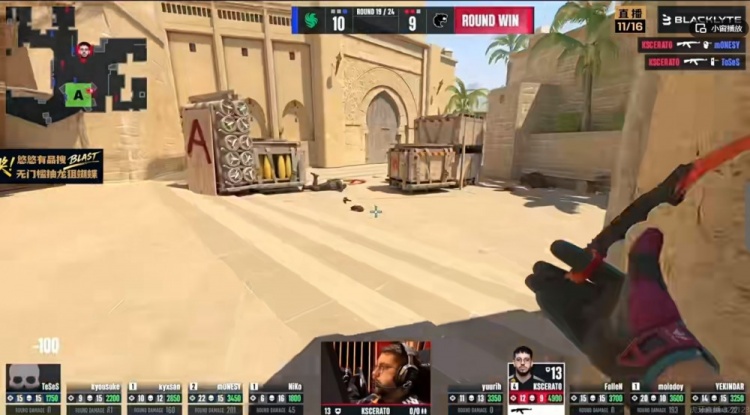 第十局FALCONS没有进攻狙,kyxsan架枪逮捕YEKINDAR!yuurih混烟1换1,NiKo想晃身直接被molodoy一甩爆头带走!残局FALCONS夹击B区但是molodoy毫无压力,本局又是大狙三杀帮助队伍继续拿分!4-6!