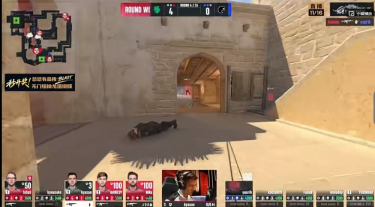 第四局FURIA选择混起,给molodoy发了一把半甲大狙!YEKINDAR下水道反杀kyousuke,但是正面molodoy大狙白给了!kyxsan拱门反摸抓到了A1的yuurih侧身!4-0!