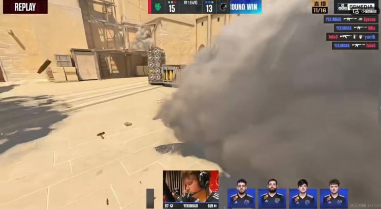 第四局Falcons爆弹打A区,但是长箱的molodoy大狙直接双杀!0换2!YEKINDAR贴烟雾三杀收尾!黑豹立马扳回一分!15-13!