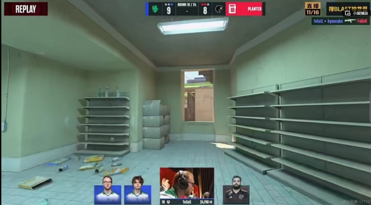 第九局FALCONS选择半起局爆弹打A区,molodoy在跳台拿下首杀又狙残了NiKo!molodoy再度peek击杀NiKo!再一甩逮捕kyousuke!三杀了!剩余两人转战B二楼,强行打出2换2,但是这分拿不到啊!4-5!