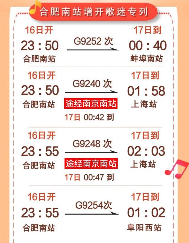为服务周末来合肥参加演唱会的观众和游客,今天深夜,合肥南站将临时加开4趟歌迷专列。4趟列车分别前往蚌埠、上海、阜阳等地。其中,G9240、G9248在南京南站经停。