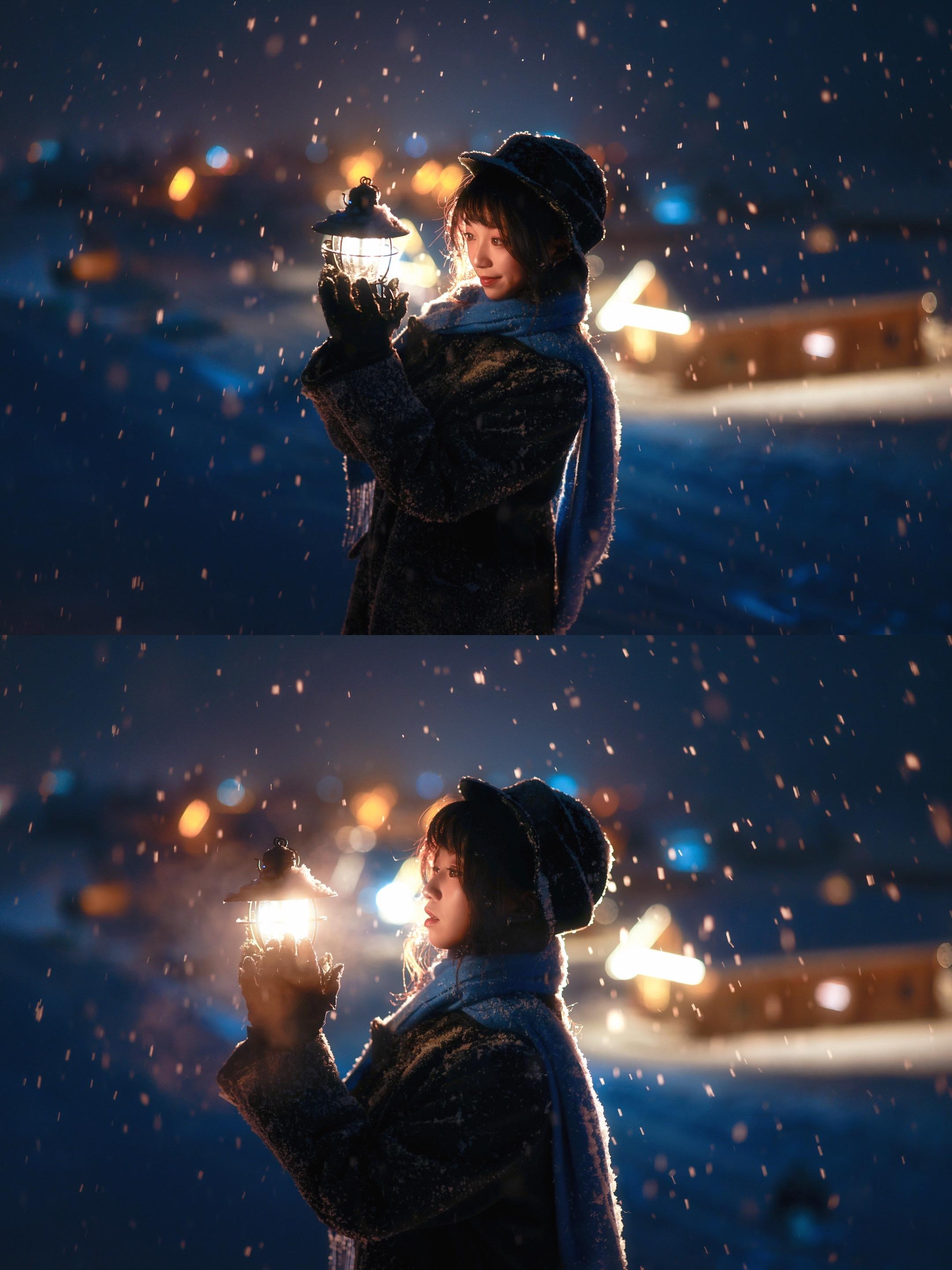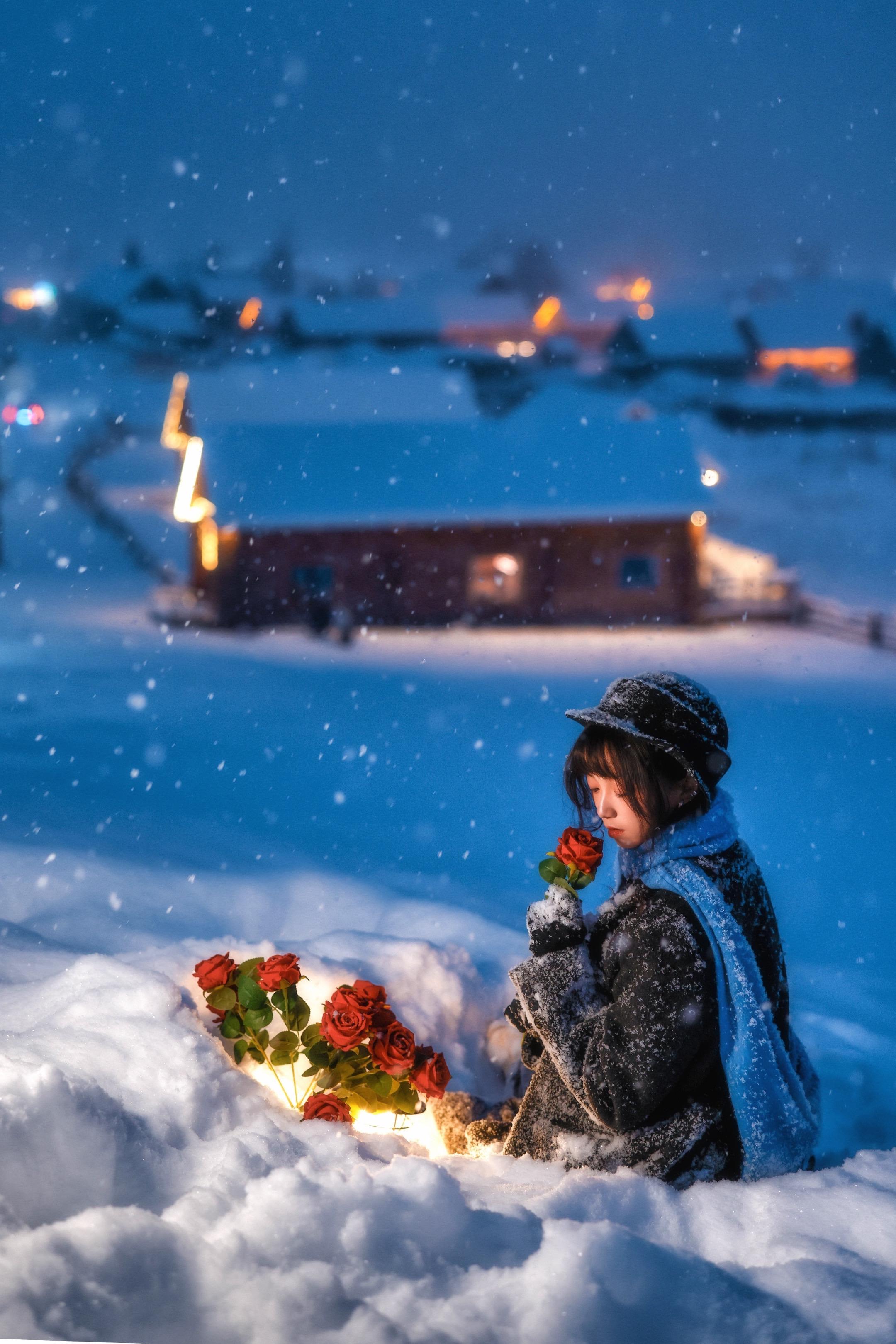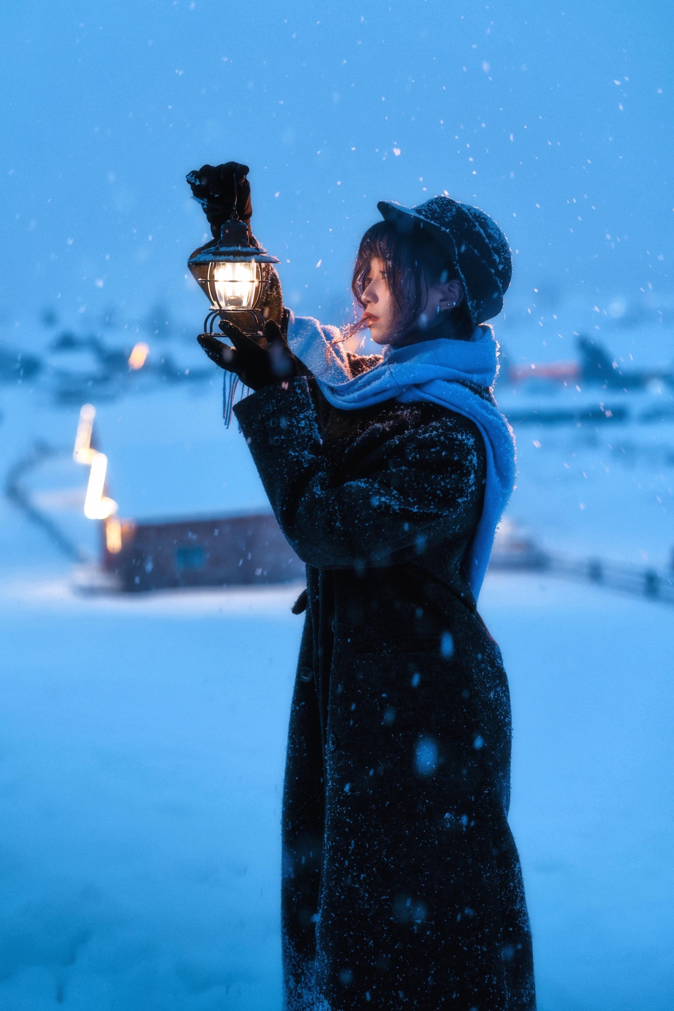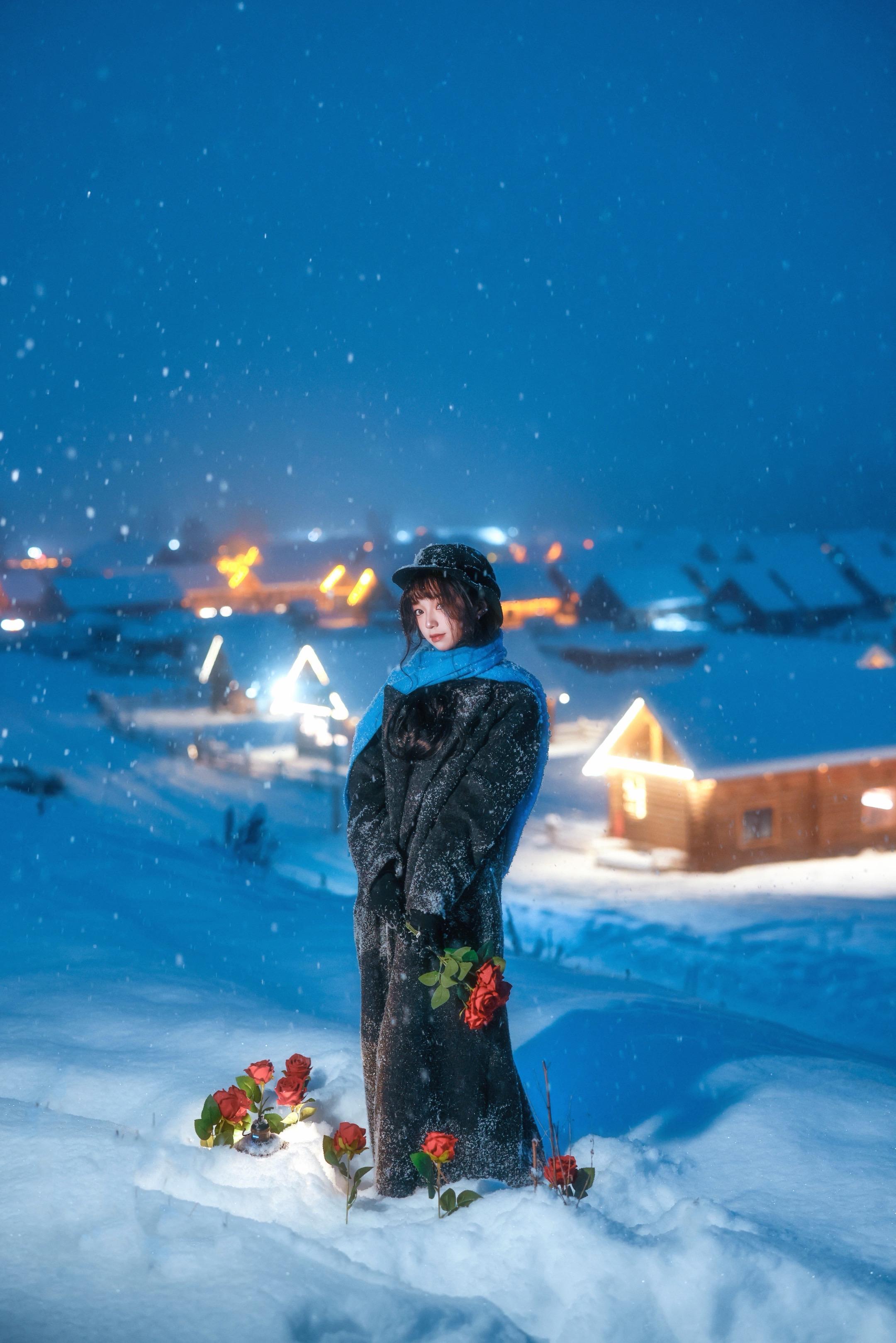 就是太阳刚下山,天还没完全黑透的那一小会儿。整个天空不是死黑,而是像打翻了一块巨大又高级的蓝色墨水盘!💙深邃的群青、温柔的湖蓝,一点点漫过小木屋的屋顶和雪白的山顶,整个世界又安静又梦幻,真的像走进了童话里!