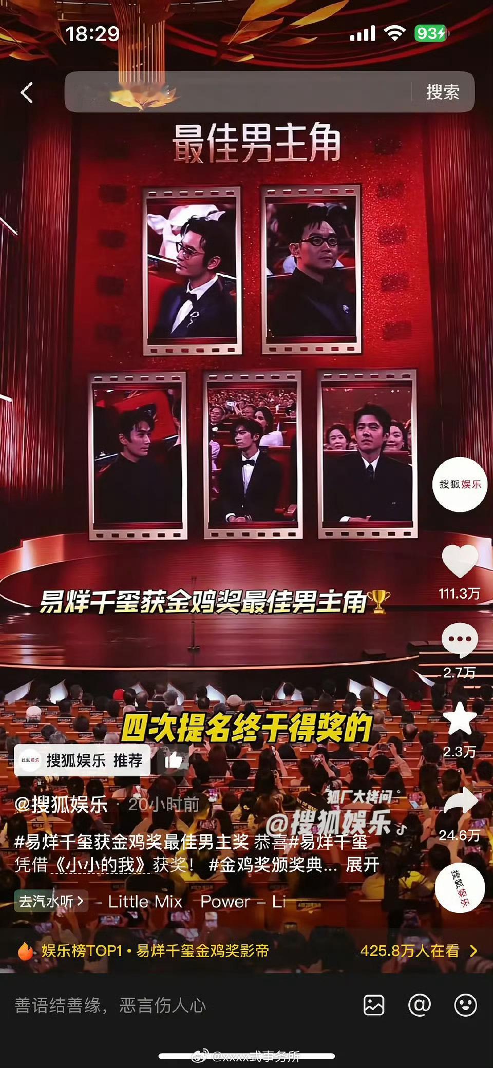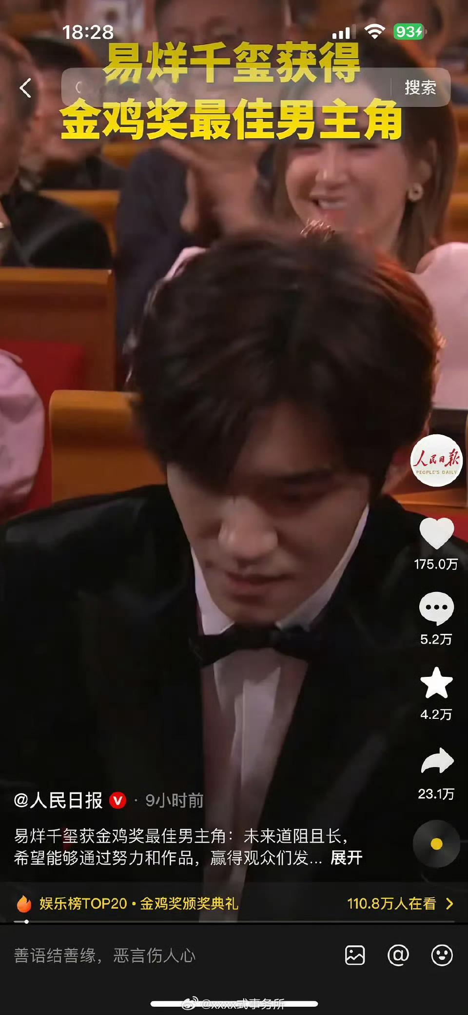 易烊千玺金鸡最佳男主已经3个百万赞了 下沉平台的认可程度有