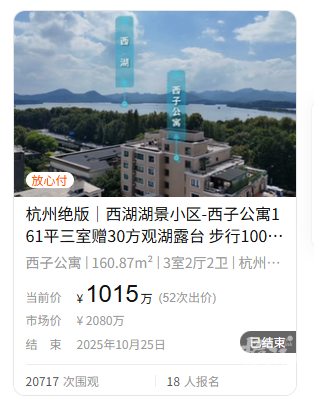 就在10月25日,西子公寓刚刚成功商拍出一套位于二楼,建筑面积为161平方米的三室房源。房源自带30平方米观湖露台,起拍价500万元,最终经过52轮出价竞拍,以1015万元,折合单价6.3万元/平方米的价格成功卖出。