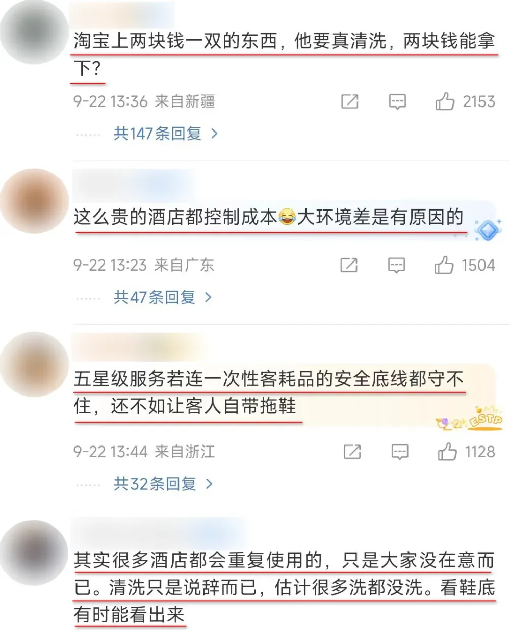 第二,酒店方声明,这种拖鞋都是一客一换的,每次都经历过清洗和消毒。只不过这一双算意外,属于“不合格产品”。而酒店方之所以这么做,都是为了环保。(拖鞋能理解!卫生不理解!!)