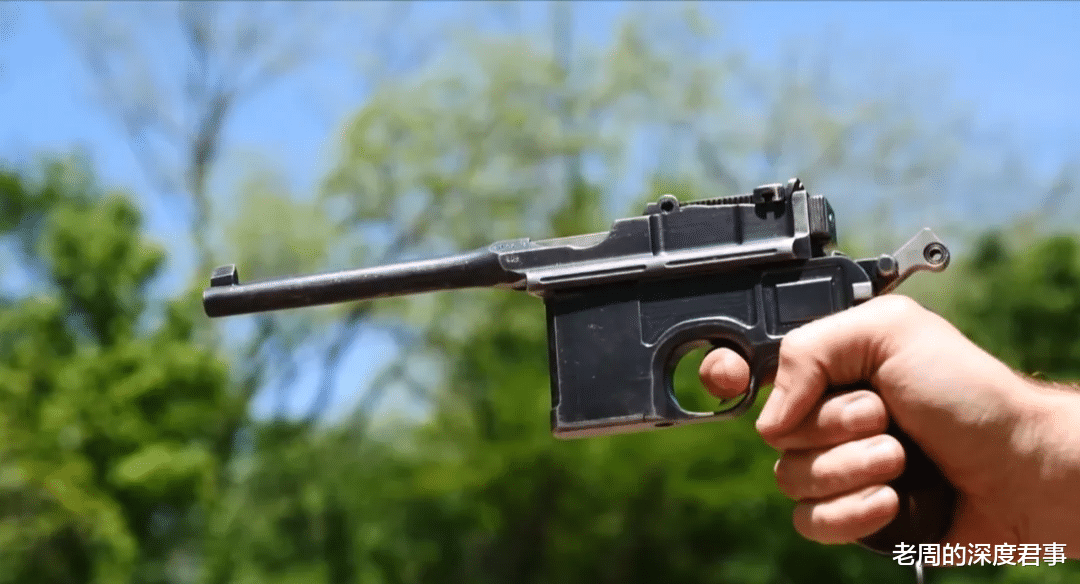 所以这支驳壳枪是可以连发射击的,早期的驳壳枪都是只能单发射击的半自动型,扣一下把扳机射出一发子弹。全自动型一扣扳机就能把弹匣里的子弹全打出去,等于就是一支小号冲锋枪了。这在驳壳枪家族里,是最顶流的。