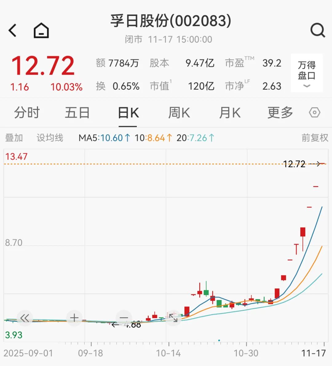 11月17日,孚日股份在集合竞价阶段即封住涨停,该股已连续拉出8个涨停板,截至收盘,报12.72元/股,股价创历史新高,总市值达120亿元,近一个月累计涨幅高达106.43%。