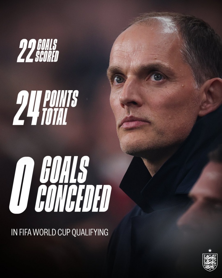 英格兰队官方社媒晒出球队世预赛战绩海报,英格兰队本届欧洲世预赛8战全胜,拿满24分,打进22球丢0球。