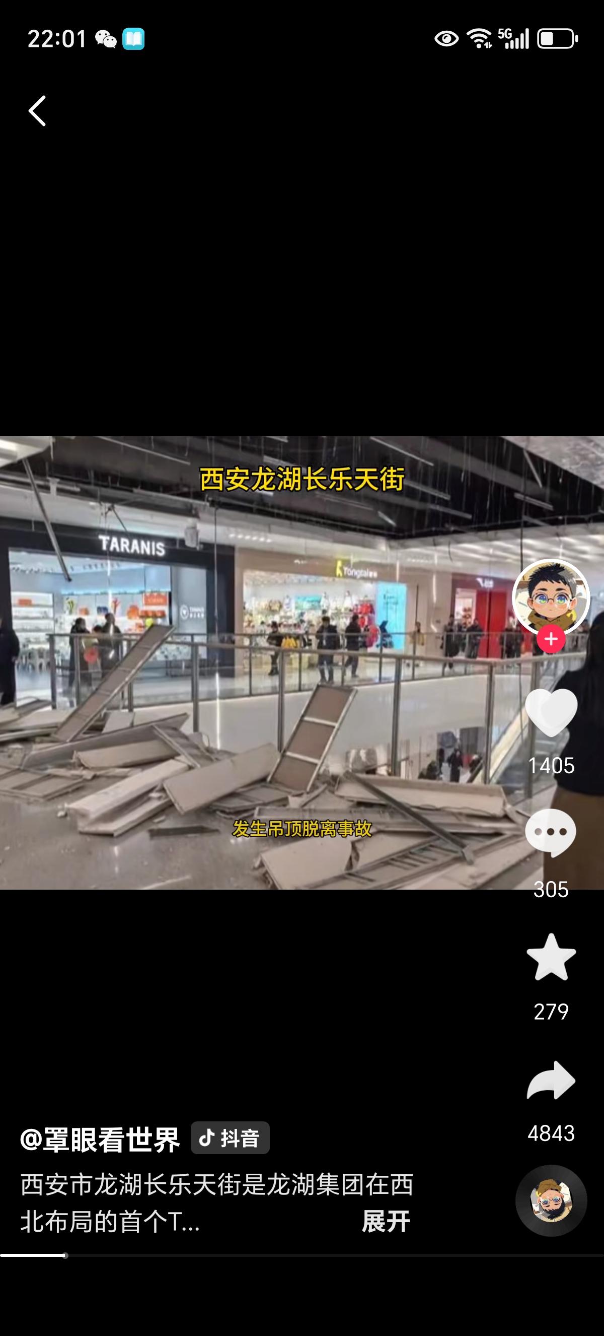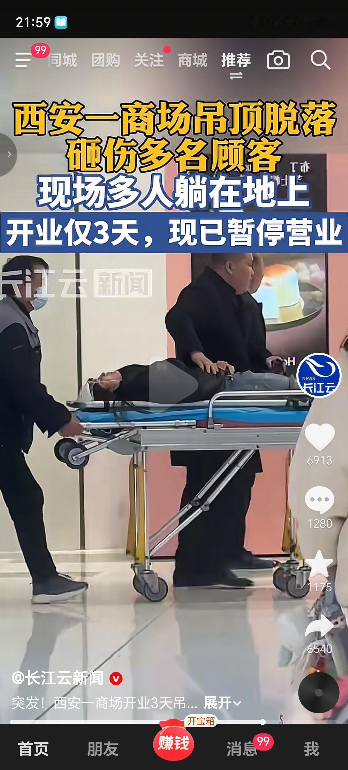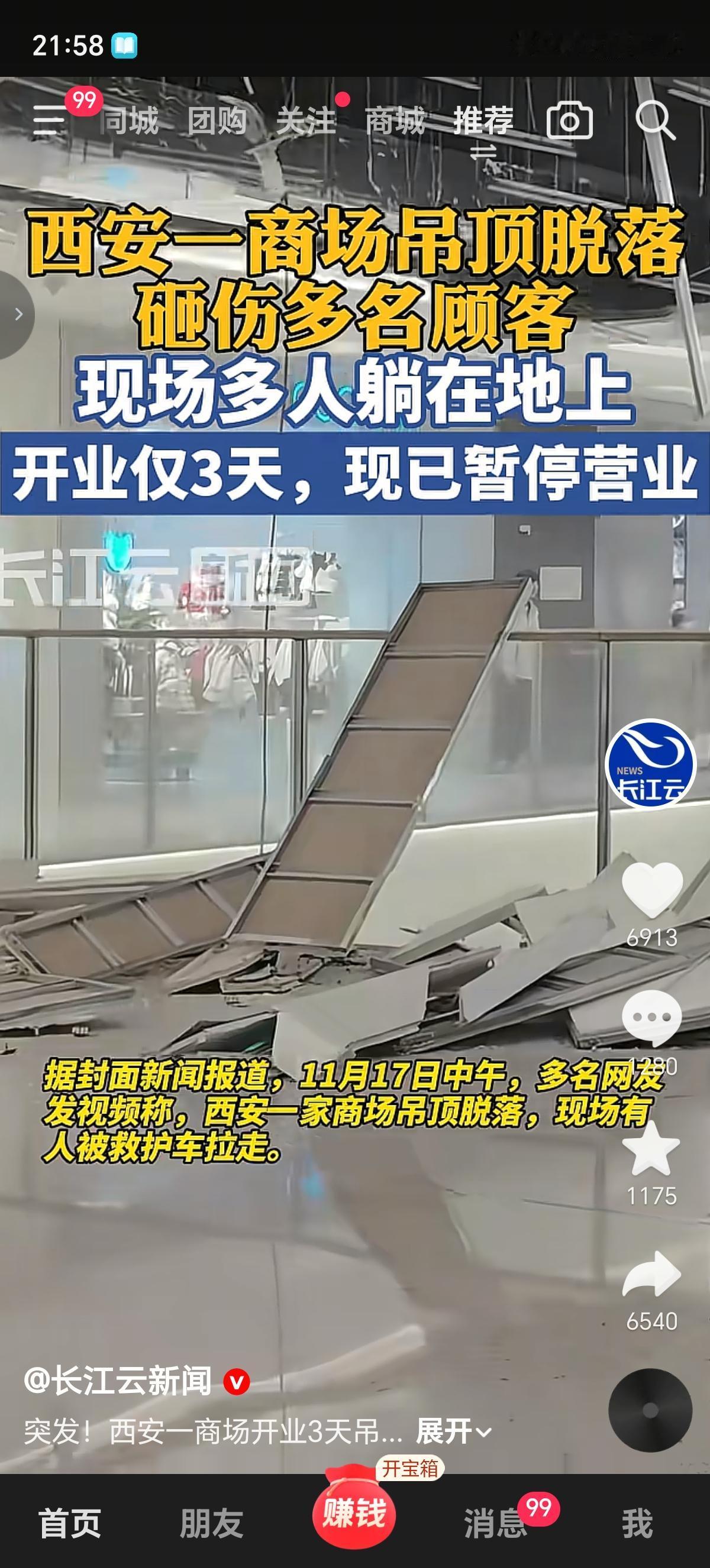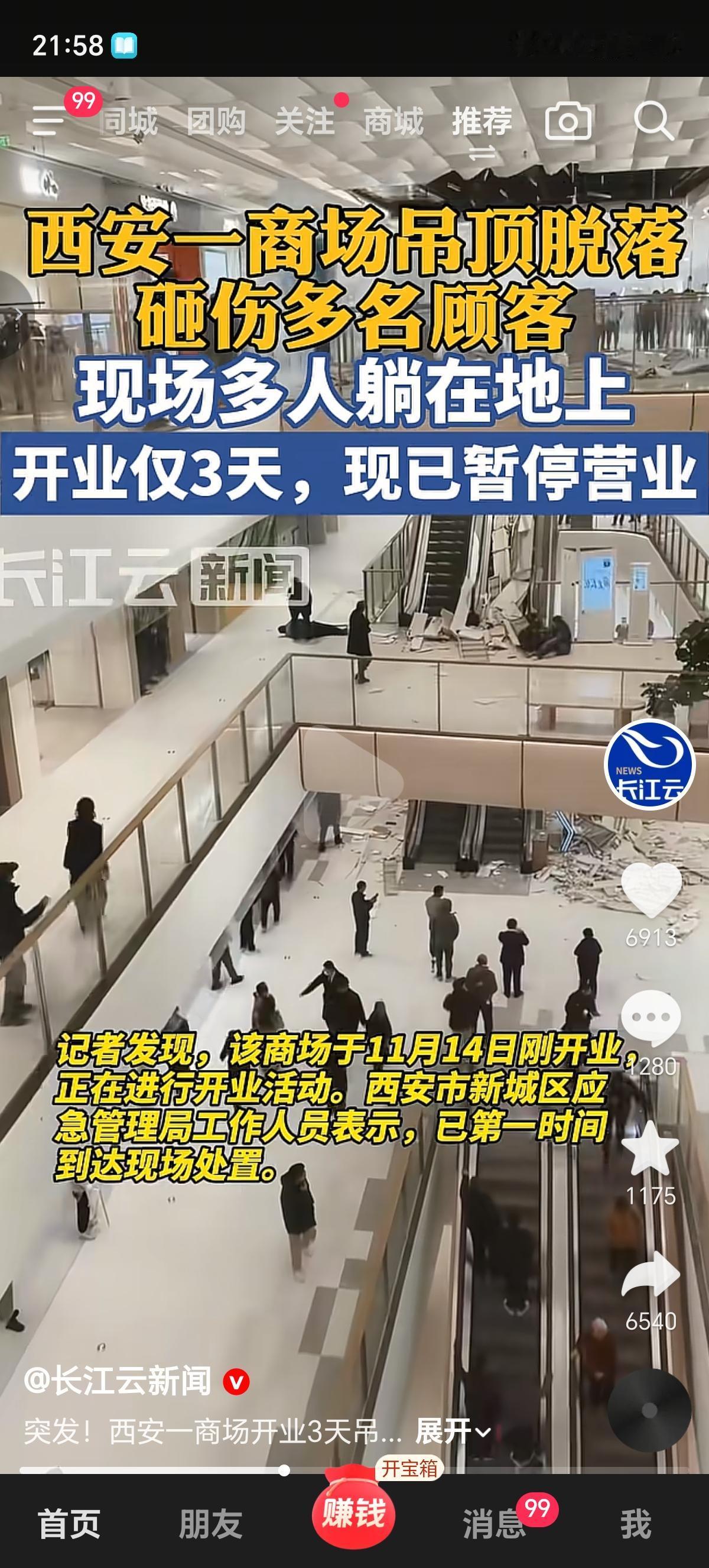 坑人界的典型代表,极品豆腐渣工程,开业即歇业,竖着进去横着出来。陕西西安龙湖长乐天街商场绝对是典型代表。11月7日,也就是今天没去那边逛街的家人们都很庆幸,实实在在的躲过一劫啊! 西安龙湖长乐天街商场开业只有3天,今天11点多钟的时候,正是逛街购物的高峰期,当时人流量不小,商场3楼扶梯上方的吊顶突然“哐当”一声掉了下来!听着都吓人,脱落的石膏板足足有30平方米那么大,直接散落在三楼到二楼的扶梯上,还有各楼层的地面上。当时现场肯定一片混乱,想想那些正在扶梯附近的顾客,真的太倒霉了。 这次事故一共造成8个人受伤,其中3人骨折,4人轻伤,还有1人脚被砸伤轻微破皮。好在伤者都第一时间被送到医院救治了,目前伤情都还算平稳,这也算是不幸中的万幸。 这个开业3天的商场马上就停业整顿了,毕竟安全问题可不敢马虎。涉事的西安龙湖地产也发了通报道歉,说已经安排专人跟进伤者的后续治疗、关怀还有赔偿的事。 现在最大的疑问就是这么大一个企业建的商场,吊顶为啥说吊就吊呢?还只维持了表面光3天,这就很不可思议了,就算纸糊的也不能坏的这么快吧?