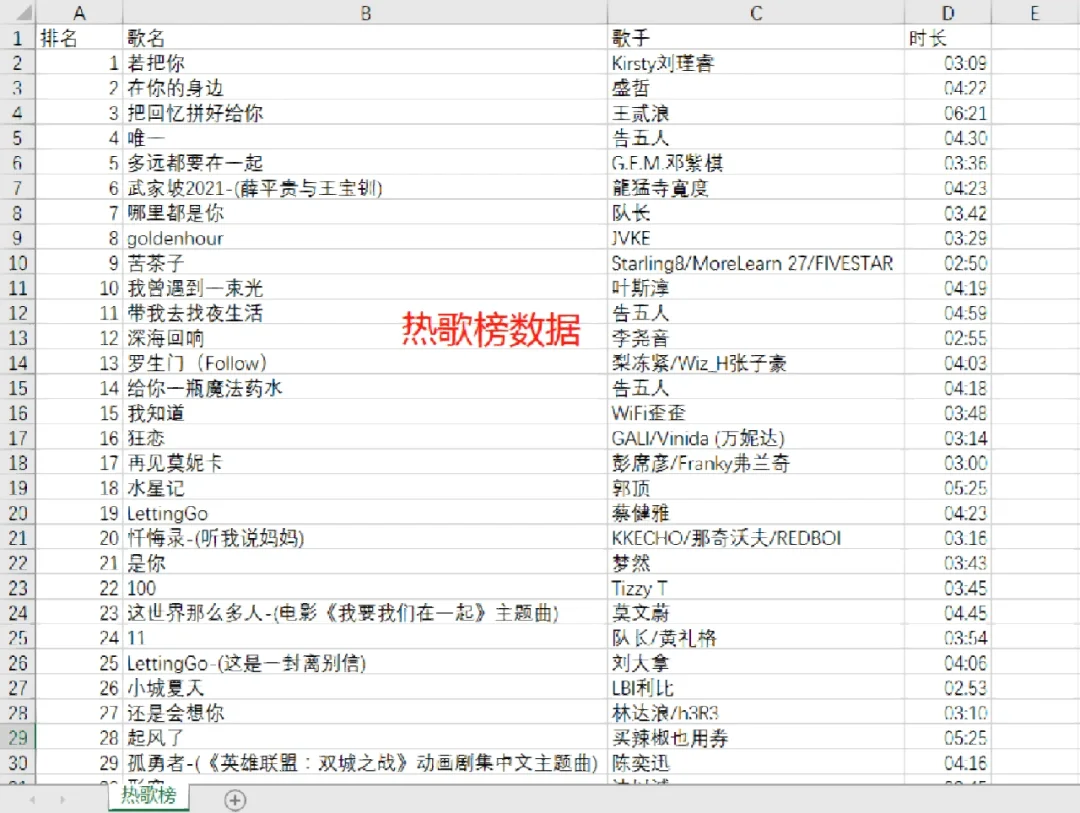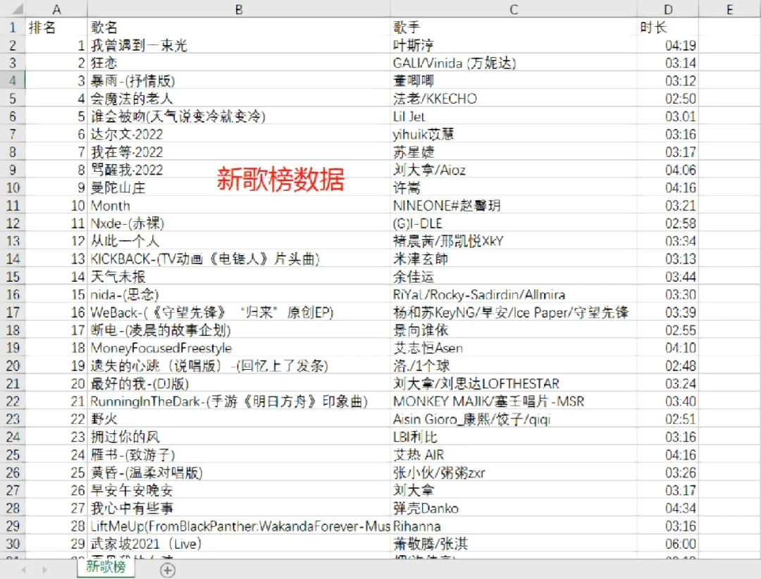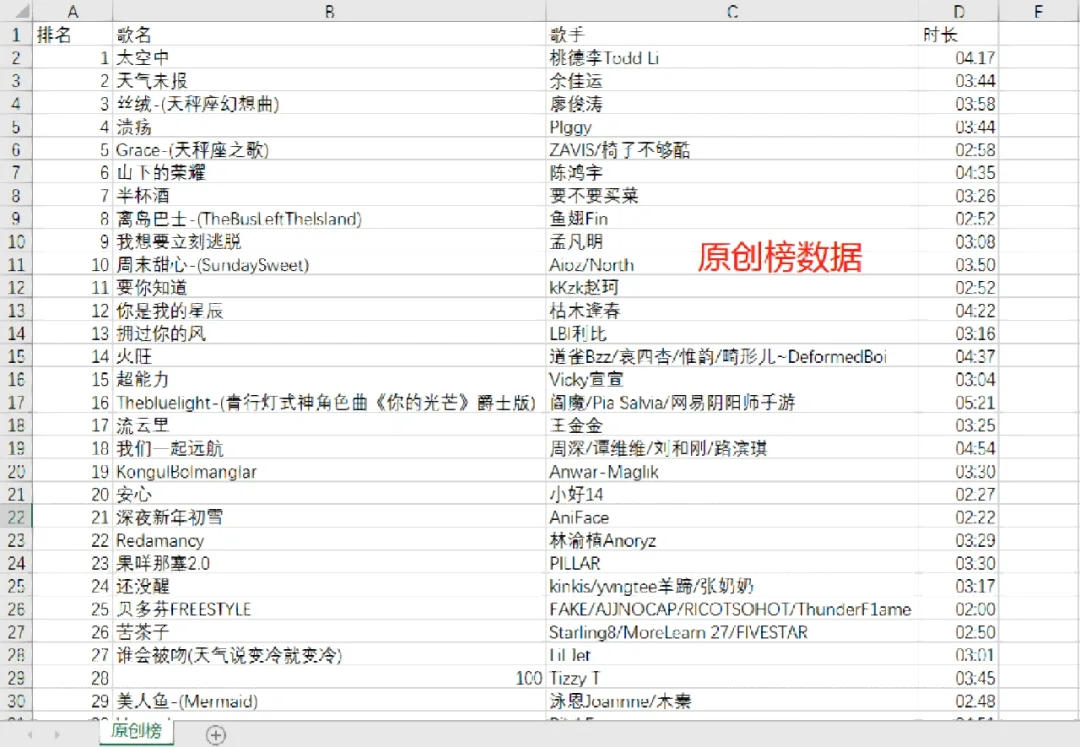 爬取的四个榜单是飙升榜,热歌榜,新歌榜和原创榜),要爬取的数据是每个榜单的歌曲排名,歌曲名,歌手和时长。