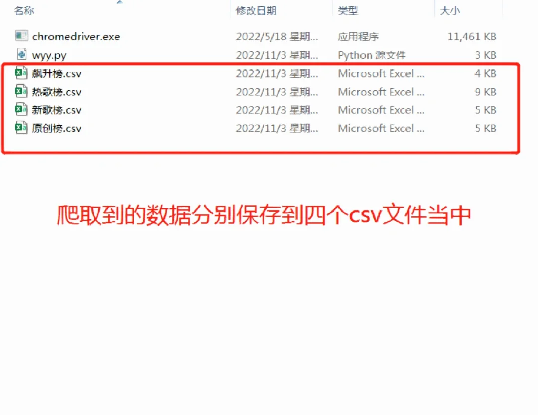 爬取到的数据分别保存到了四个榜单对应的csv文件当中。