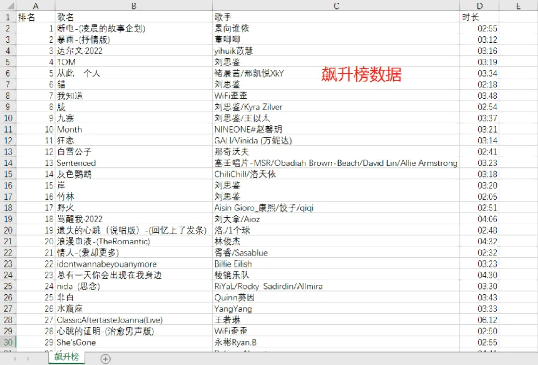 分别是四个榜单爬取到的歌曲排名,歌名,歌手和时长四个字段数据。
