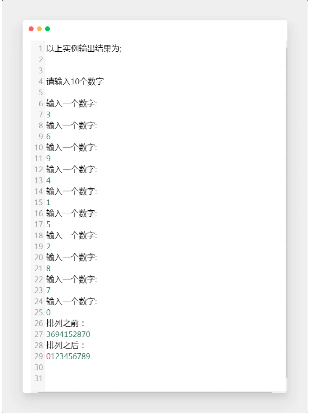 Python经典实例3⃣7⃣ ~ ⭐️题目: 对10个数进行排序。 ~ 🌟程序分析: 可以利用选择法,即从后9个比较过程中,选择一个最小的与第一个元素交换,下次类推,即用第二个元素与后8个进行比较,并进行交换。 ~ ❗️❗️❗️三连击哦~~~ ~