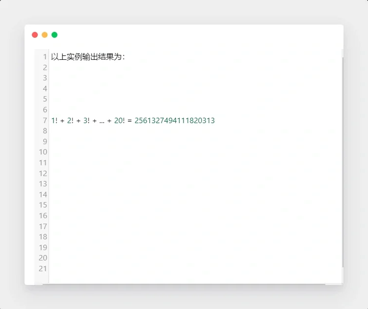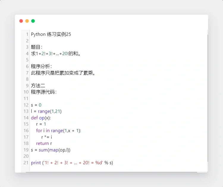 Python经典实例2⃣5⃣ ~ ⭐️题目: 求1+2!+3!+...+20!的和。 ~ 🌟程序分析: 此程序只是把累加变成了累乘。 ~ ❗️❗️❗️本题可以用两种方法做 ✅图一为方法一 ✅图二为方法二 ~ ❗️❗️❗️两张种方法的结果都一样➡️图三 ~
