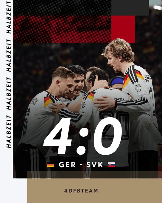 虎扑11月17日讯世界杯欧洲区预选赛,德国半场4-0斯洛伐克。