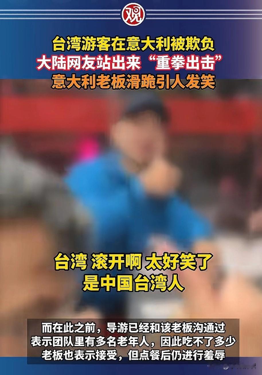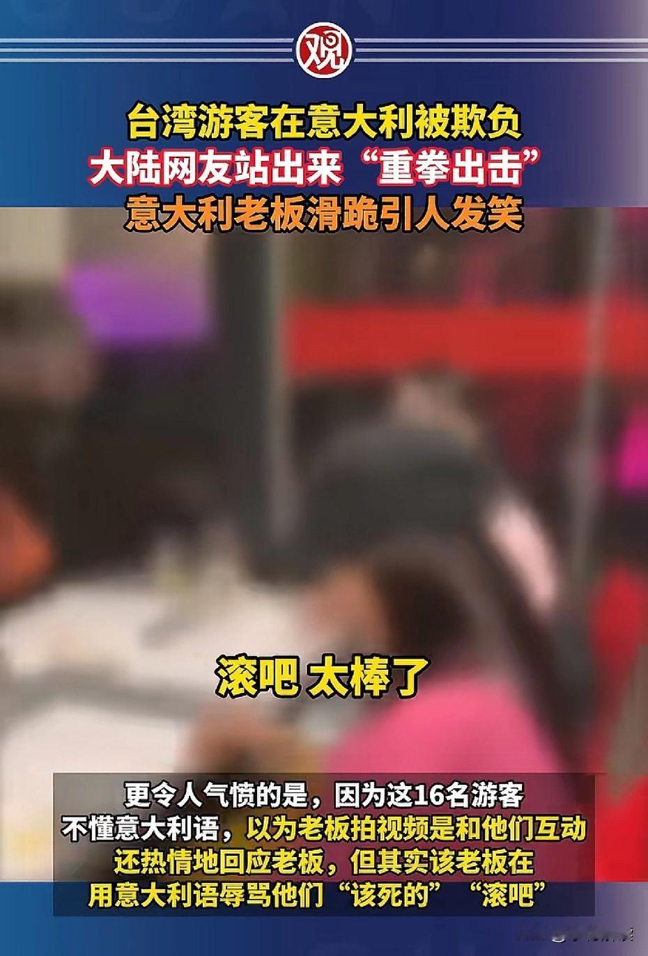 意大利人骂台湾省同胞,大陆网友重拳出击! 台湾的老年团去意大利旅游,16个人点了5份披萨,被老板边拍视频边骂。结果大陆网友看到了,毫不犹豫就冲上去围攻老板的社交账号,老板被迫道歉。 但这个时候部分台湾网友也指责老年团不懂规矩,说不该点这么少,这点我倒是认同的确实16个人5个披萨,放哪里都不合适。 但是不管怎么样,首先意大利老板是骂人了,点的少,你可以和他们好好说,再是沟通不了,没有ai吗?不能翻译吗? 大陆网友就是护短,根本不在意你哪个省份的人[大笑] 图片来源观察者网