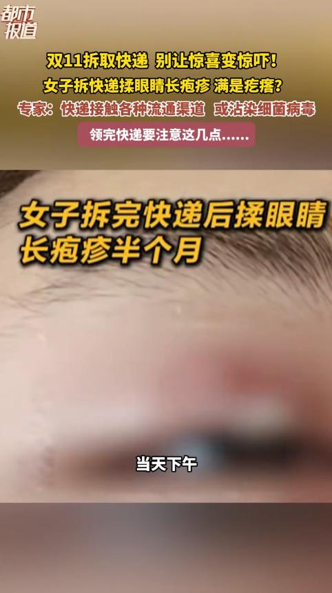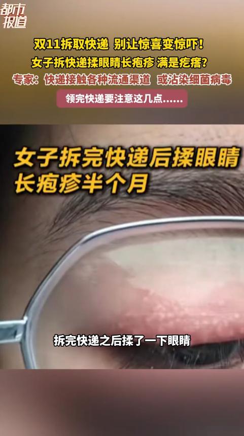 “悲剧还是发生了!”近日,江西瑞昌,一女子的快递送达后,她迫不及待的拆开检查,然后顺手揉了下眼睛,结果眼睛越揉越痒,还出现了红肿等症状!到了晚上,女子发现眼睛周围长满了疙瘩,医生诊断为疱疹。网友:快递不是一般的脏! 购物节刚过去,相信大家的快递都陆续送到家了,但是大家拆完快递后可不要着急,一定要先洗手,毕竟你不知道快递这一路经历了什么,上面不知道有多脏。 据媒体11月14日的报道,余女士前不久收到快递后,兴奋地将其打开检查,刚好此时感觉眼睛有点痒,她就顺手揉了一下。 可余女士感觉越揉越痒,根本停不下来,直到眼睛被揉肿了,她才停下来。余女士以为是用眼过度导致的,所以并没有放在心上,可到了晚上,却出事了! 晚上照镜子时,余女士发现眼睛周围都是小疙瘩,看起来非常吓人,于是她立即赶往医院检查。 医生化验后确认,这是长了疱疹,而病因就出在余女士的快递上! 由于余女士拆完快递没洗手,再加上自身的抵抗力较低,所以被包装上的病毒趁虚而入,经过半个月的治疗,余女士这才恢复了健康。 购物节导致快递量激增,快递在运输过程中更容易被污染,所以大家在拆快递时,应尽量佩戴一次性手套,或者拆完就及时洗手,以免沾染细菌。 信息来源:《11月14日,江西,女子拆完快递揉眼睛长疱疹,满是疙瘩,双十一刚过,女子发文提醒,拆完快递一定要记得洗手。》济南新闻综合广播
