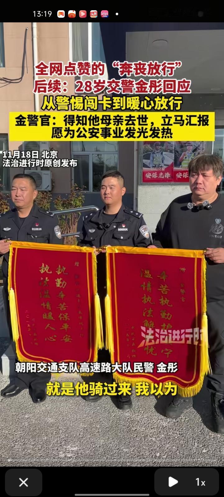 书接上回,宋先生得知母亲去世后,骑着摩托急忙跑回家奔丧,途中被交警拦截,宋先生带着哭腔说道:“警官,我妈没了,我回家看我妈去,我着急”。交警得知情况后,迅速为他报备放行,还不忘嘱咐他一句“节哀,不好意思耽误您了”。 现在,那位好心交警找到了,他就是北京市朝阳交通支队高速路大队民警金彤,今年28岁,从警六年。金彤表示,感谢他对我们公安工作的理解和认可,会继续保持为民服务的心态。 这件事告诉我们,在法律和人情之间,不是非黑即白,而是要用心去平衡。群众遇到紧急情况,作为执法者,再维护规则的同时,更要有一点温度,这就是我们应该做的。