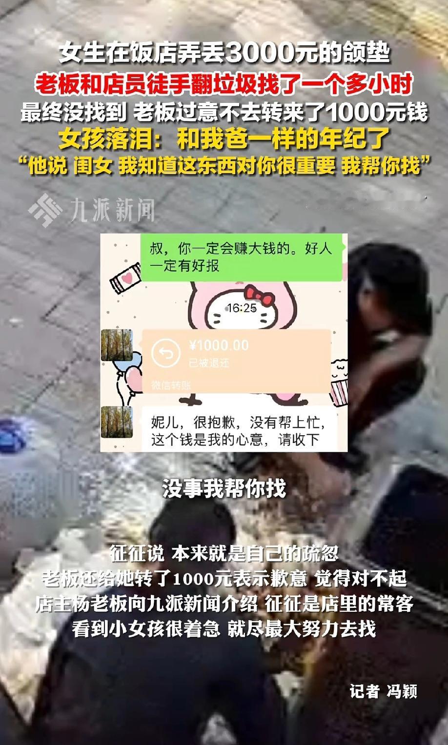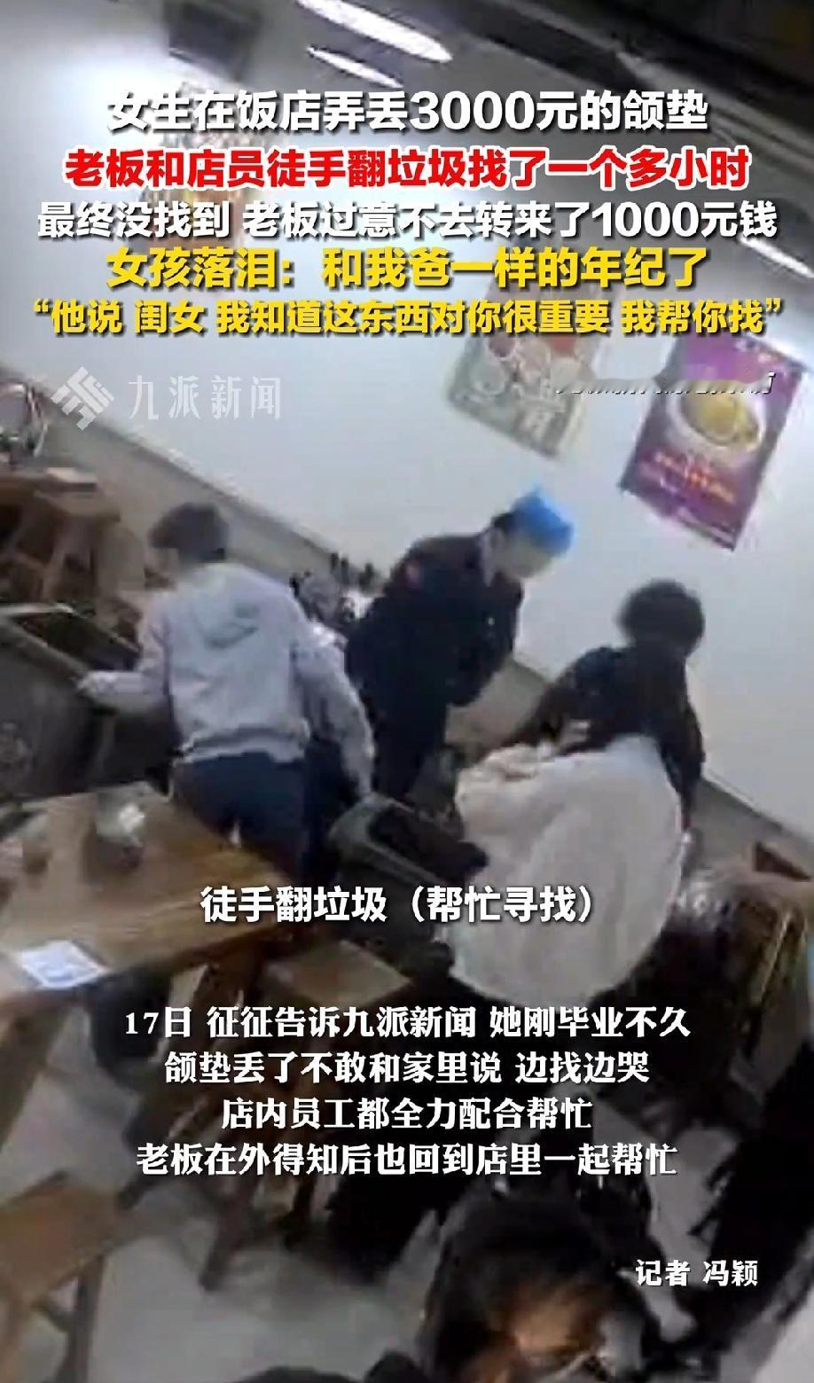 太暖心了!河南郑州,一位刚工作没多久的女生,像往常一样前往平常时间经常去的那家饭馆喝胡辣汤,由于吃饭完着急赶路,一不小心就将随身带的3000元的颌垫落在了餐桌上。等女生快到家了才猛然想起,心里一慌,就赶紧掉头往饭馆跑,让她十分感动的是,老板和店员一听,居然徒手在垃圾桶里帮她翻找了一个小时,事后,老板看她哭的伤心,心里十分过意不去,还给她转了1000块钱。 (来源:九派新闻) 据了解,颌垫是征征在口腔机构定制的矫正咬合,花了3000块钱不说,重新做还得多次复诊取模,又费钱又耗时。 对刚入职、工资不高的征征来说,这事儿简直让人手足无措。 等她赶回饭馆时,店员已经收拾完餐桌,垃圾都运到后厨的大垃圾桶里了。 征征红着眼眶跟老板杨师傅说明情况,没想到杨师傅二话没说,挽起袖子就说了句:“闺女,我知道这东西对你很重要,我帮你找。” 后厨的垃圾桶里装满了剩饭剩菜、纸巾和油污,散发着难闻的恶臭,杨师傅连手套都没戴,直接徒手蹲在桶边翻找起来。 看着杨师傅的背影,征征心里又感动又难受。她说,杨师傅和自己爸爸年纪差不多,却因为自己的疏忽,在又脏又臭的垃圾里翻找。 她好几次拉着杨师傅的胳膊说“别找了,太麻烦了”,可杨师傅只是摆摆手,还招呼店里的小哥哥、小姐姐和阿姨们一起帮忙。 一群人围着垃圾桶,蹲在地上仔细翻找,手指被油污弄脏了也不在意,生怕错过那个小小的颌垫。 时间一分一秒过去,整整一个多小时,垃圾桶里的垃圾几乎都被翻了个遍,可还是没找到颌垫。 征征知道,大概率是垃圾已经被清运车拉走了,她心里又失落又愧疚,一个劲儿地跟大家说谢谢。 让征征没想到的是,杨师傅反倒觉得过意不去,当天晚上就给她转来了1000块钱,还说:“很抱歉,没有帮上忙,这个钱是我的心意,请收下。” 看着手机里的信息,想起杨师傅徒手翻垃圾的样子,征征一下子就哭了。 后来,她特意买了礼品回店里致谢,发现店员们居然还在悄悄帮她留意颌垫的踪迹。 其实,杨师傅和店员们本没有义务这么做,丢东西是征征自己的疏忽。 可他们没有半点推脱,反而用最实在的行动帮忙,没找到还主动补偿,这份善意特别难得。 现在大家总说人情淡薄,可这个小饭馆里的故事告诉我们,善良从来没缺席。 3000块的颌垫是物质价值,而杨师傅他们徒手翻垃圾的坚持、主动转账的诚意,是再多钱也买不来的温暖。 对刚工作的年轻人来说,这样的善意不仅缓解了经济压力,更治愈了独自打拼的窘迫。说到底,生活里的感动,往往就藏在这些平凡人的举手投足间。