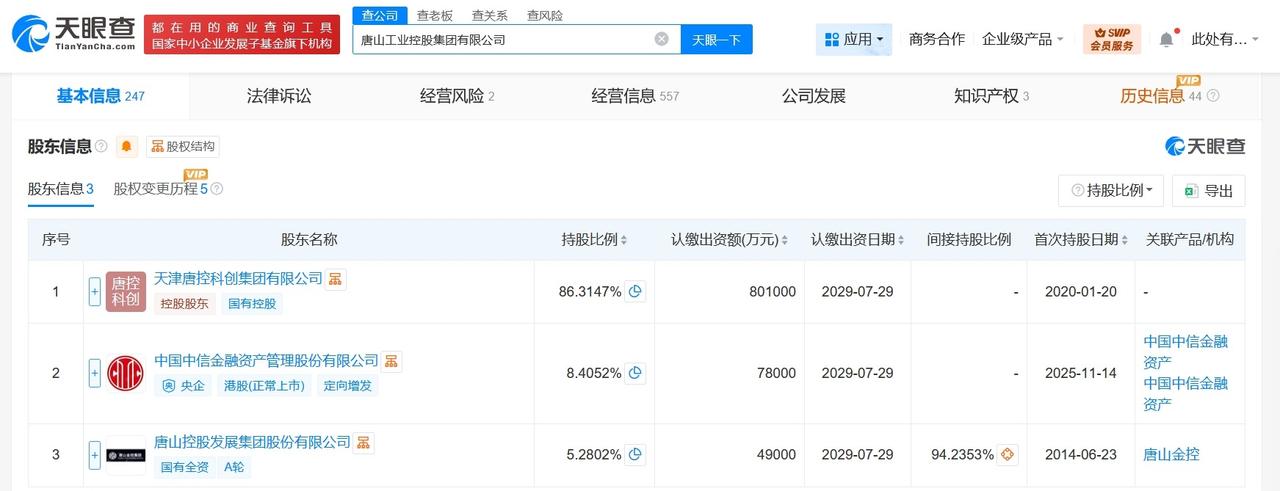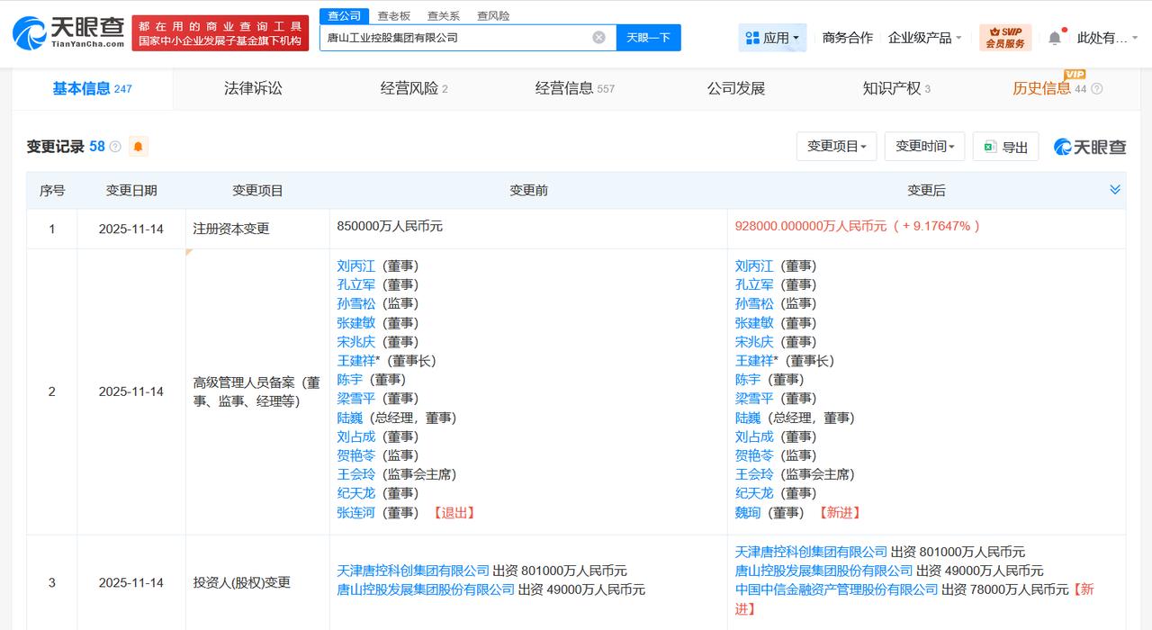 中信金融资产入股唐山工业控股集团后者增资至92.8亿 天眼查工商信息显示,近日,唐山工业控股集团有限公司发生工商变更,新增中国中信金融资产管理股份有限公司为股东,注册资本由85亿人民币增至92.8亿人民币,增幅约9%,同时,部分高管也发生变更。 唐山工业控股集团有限公司成立于2014年6月,法定代表人为王建祥,经营范围含企业总部管理、科技中介服务、知识产权服务、企业管理咨询、金属结构销售、金属材料销售、高品质特种钢铁材料销售、化工产品销售等。股东信息显示,该公司由天津唐控科创集团有限公司、唐山控股发展集团股份有限公司及上述新增股东共同持股。 天眼查信息: