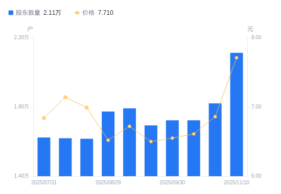日期A股户数(户)流通A股户均持股数(股)户均持股市值(万元)2025-11-102112214501.5211.182025-10-201820416826.0411.542025-10-101723017777.2011.752025-09-301723117776.1711.642025-09-191693318089.0111.762025-09-101792017092.7011.492025-08-291773817268.0811.262025-08-201616418949.5913.252025-08-081619118917.9913.512025-07-311623818863.2312.90