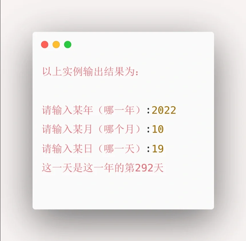 Python小项目[零R][五R] ~ [火R]要求: [一R]输入某年某月某日,判断这一天是这一年的第几天? [二R]以3月5日为例,应该先把前两个月的加起来,然后再加上5天即本年的第几天。 ~ [火R][火R][火R]特殊情况:闰年且输入月份大于2时需考虑多加一天。 ~