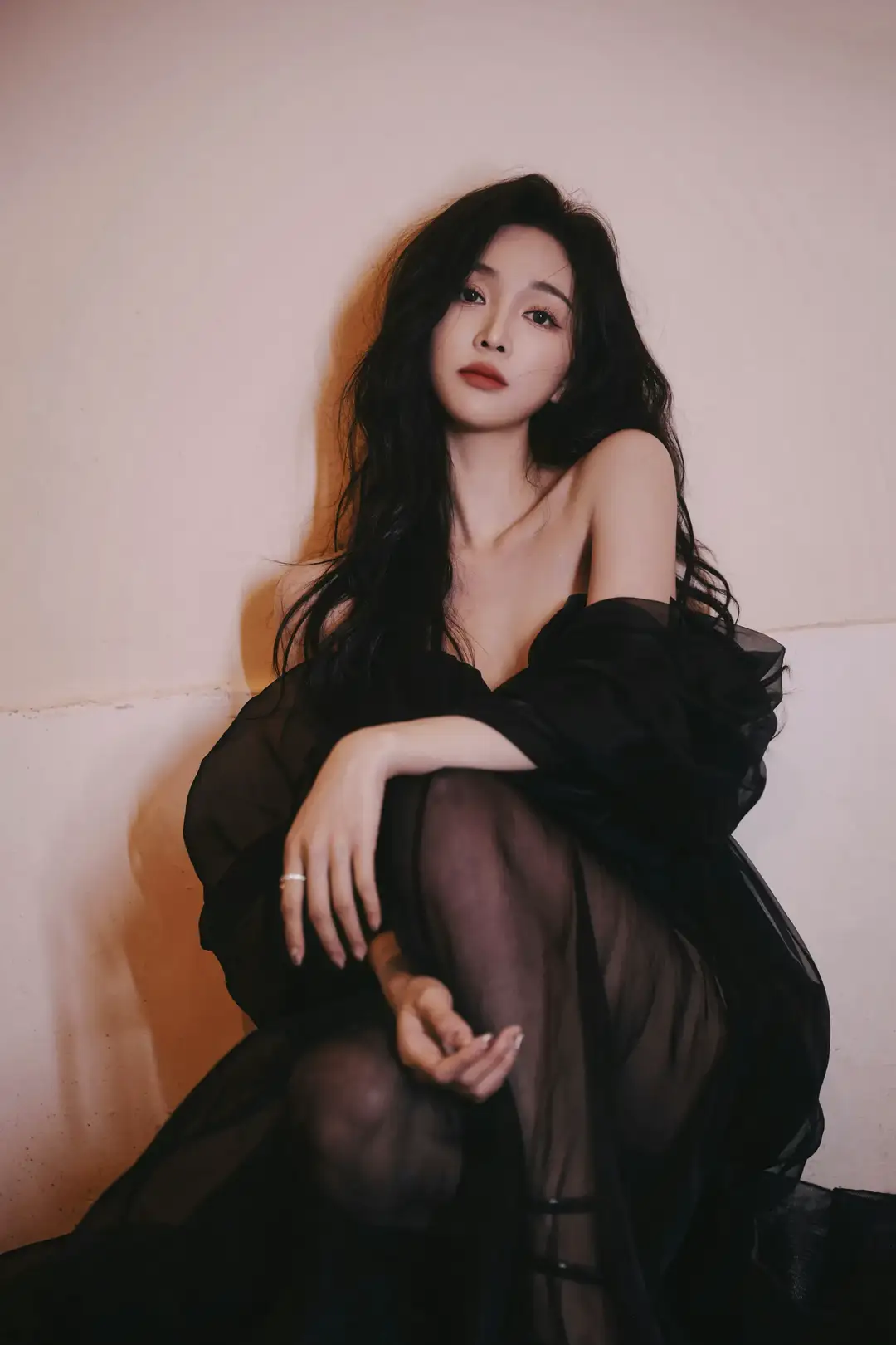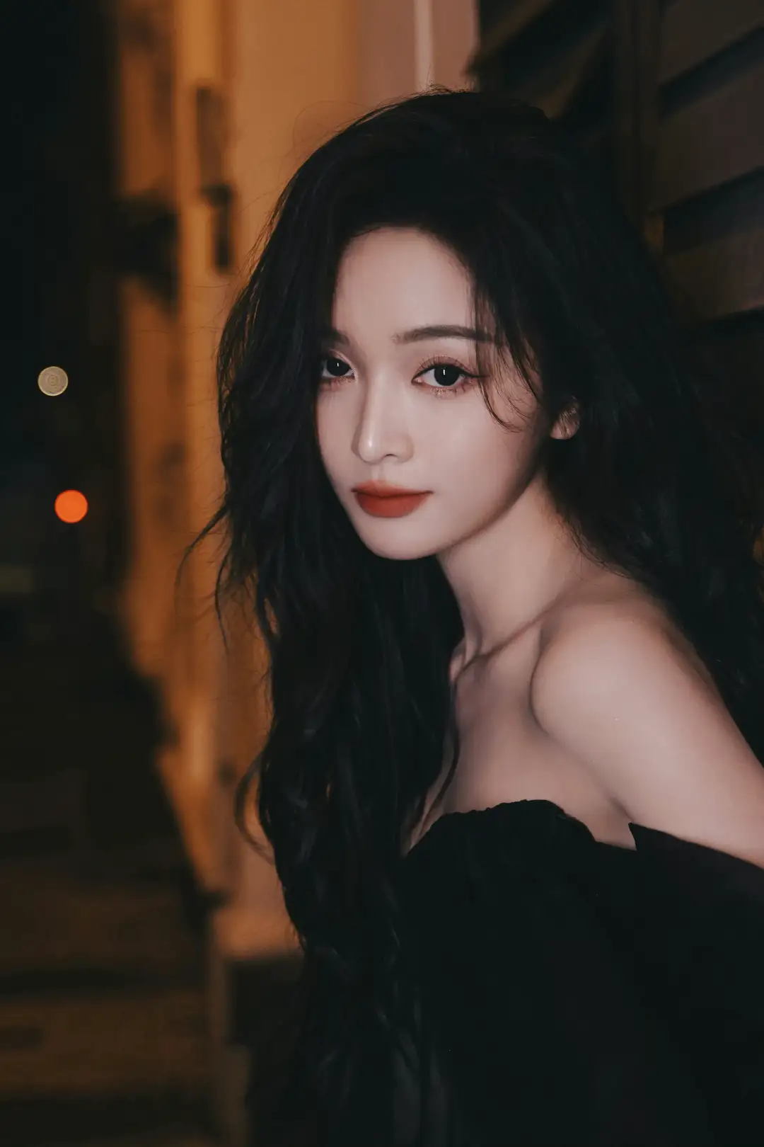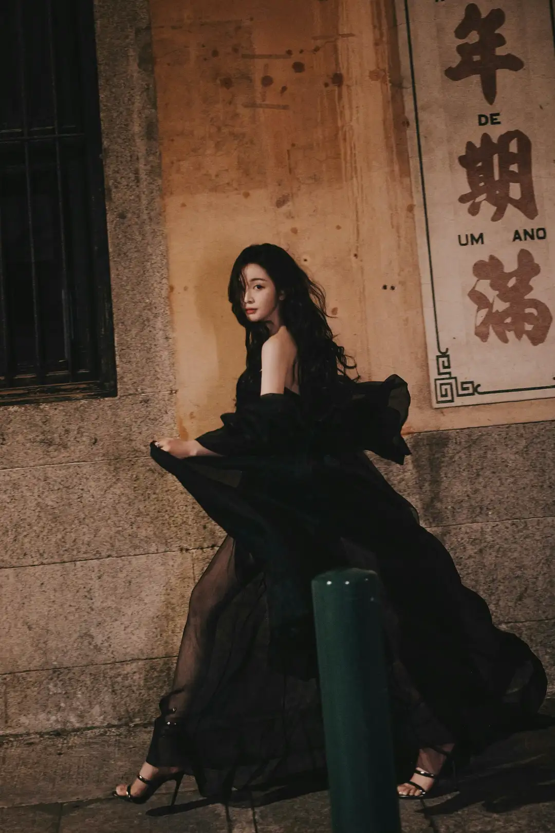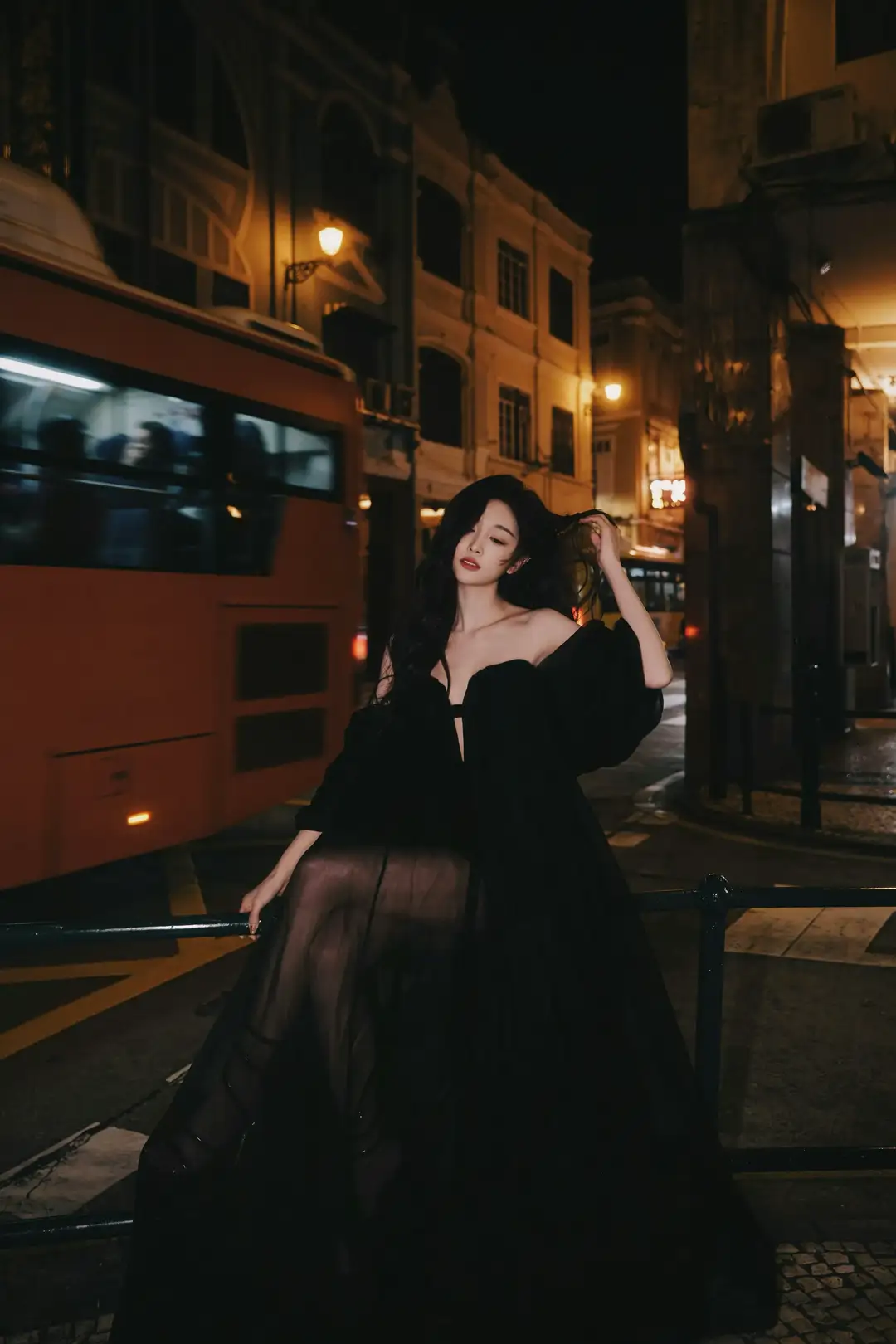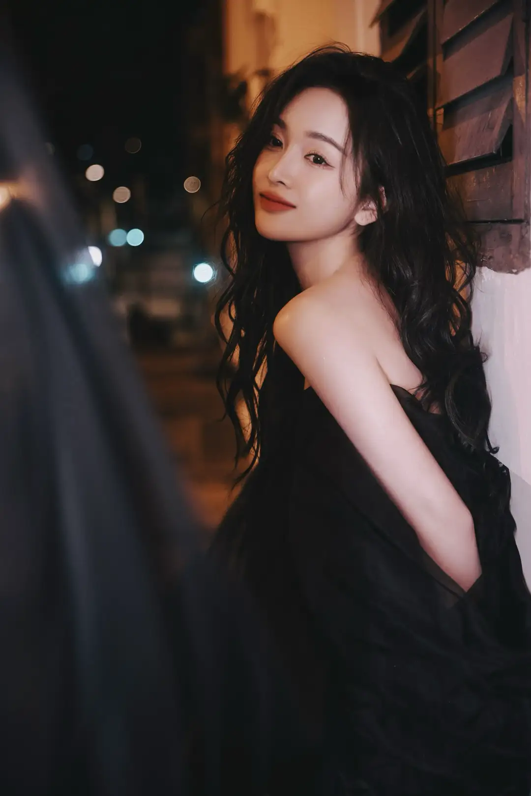 夜晚的优雅漫步,黑色长裙飘飘,尽显都市女郎的魅力。(吴宣仪)