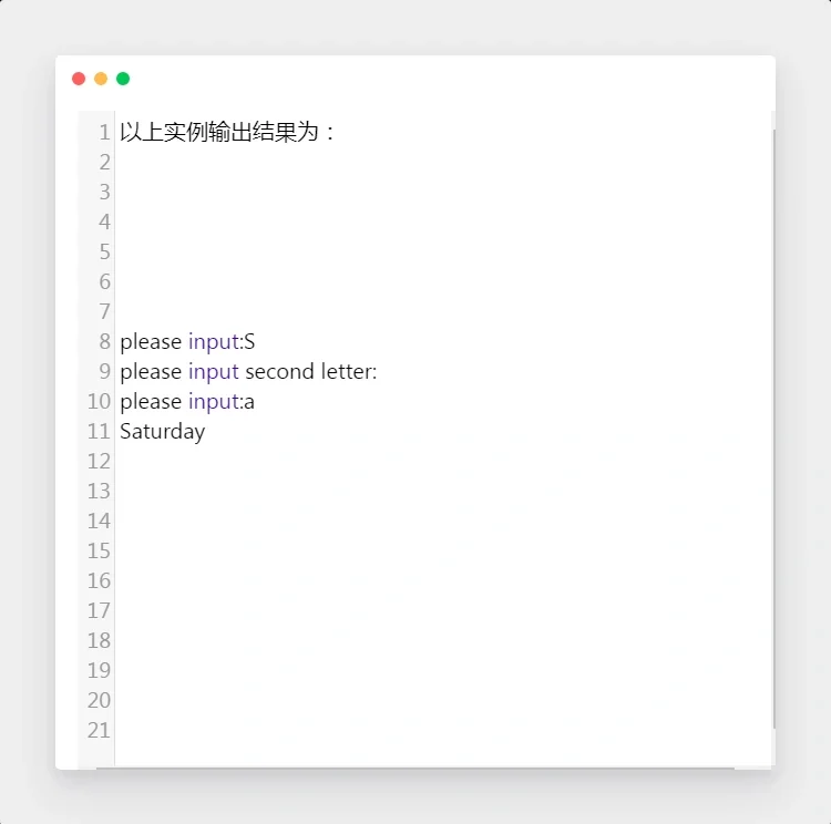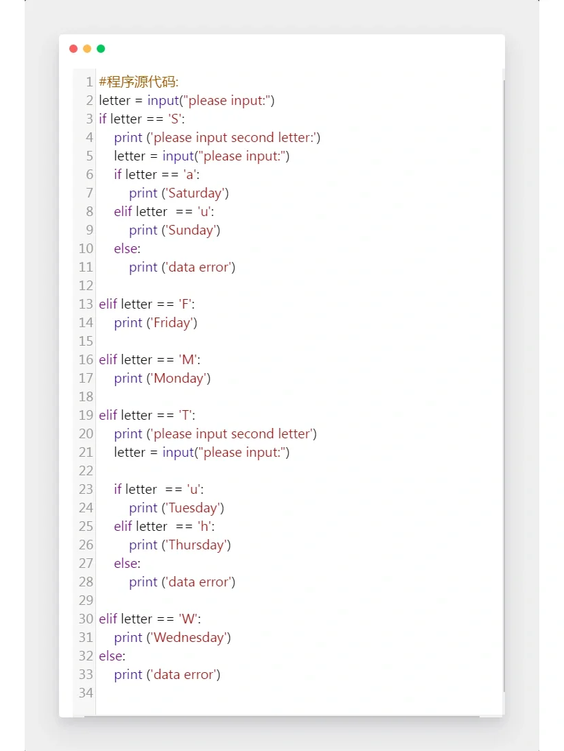 Python经典实例3⃣1⃣ ~ ⭐️题目: 请输入星期几的第一个字母来判断一下是星期几 如果第一个字母一样 则继续判断第二个字母。 ~ 🌟程序分析: 用情况语句比较好 如果第一个字母一样 则判断用情况语句或if语句判断第二个字母。 ~ ❗️❗️❗️本题的重点是怎么用if语句去判断第二个字母 ~